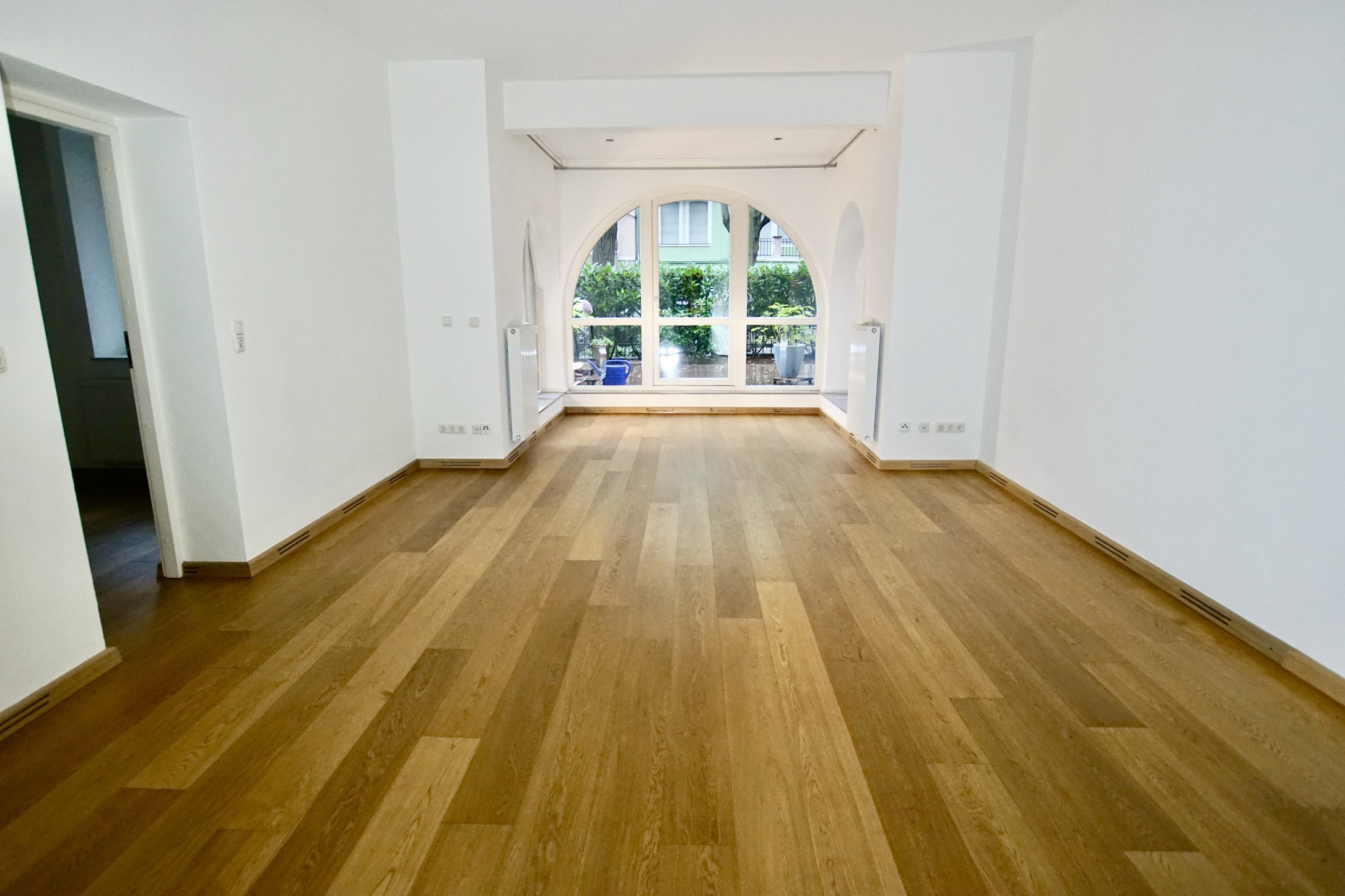Diese frisch renovierte Erdgeschosswohnung mit neu gestalteter, begrünter Terrasse liegt in einem charmanten Altbau entlang einer malerischen Allee im beliebten Rheingauviertel.