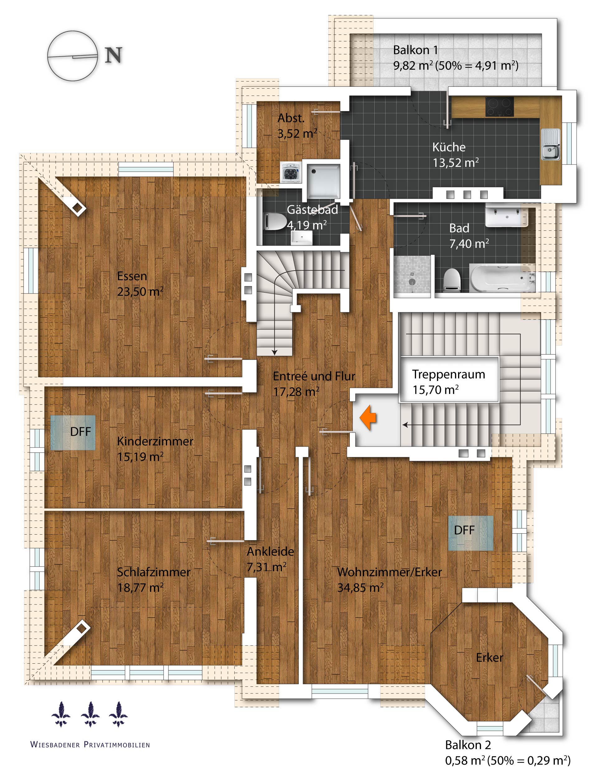 Mit fünf Zimmern, zwei Bädern, Waschküche und einem Balkon ist hier ausreichend Platz für Familien und Paare mit großem Platzbedarf.
