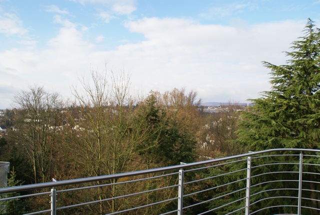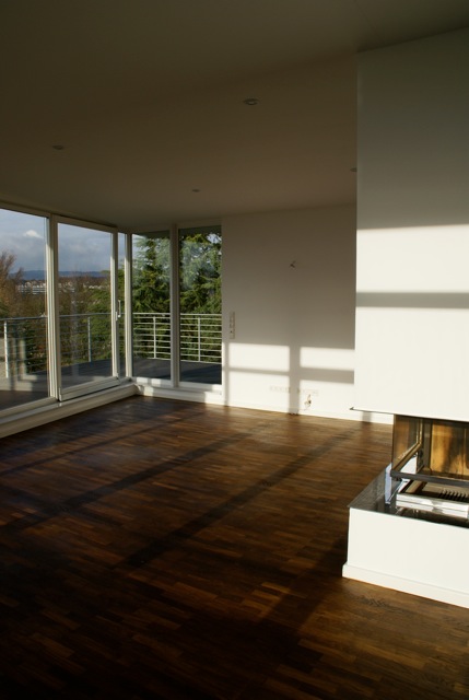Die Wohnung ist exklusiv ausgestattet mit geöltem Holzboden aus Räuchereiche, Deckenstrahlern, Dolby surround System im Wohnzimmer, verchromtem Kamin, Einbauschränken im Flur und Schlafzimmer, 2 Bädern und elektrischen Jalousien und einer hochwertigen Einbauküche. Der 85 qm große Balkon umläuft die Wohnung komplett und verfügt an der Ostseite über einen überdachten Sitzplatz.