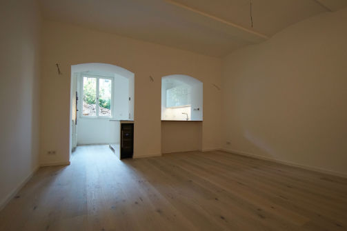 Traumhafte Gartengeschoßwohnung in kernsanierter Altbauvilla in bester Lage der City-Ost von Wiesbaden. Offener Küchenbereich mit Esszimmer und der durch Holzschiebetür abgetrennte Wohnbereich eröffnen sich zur großen, ebenerdigen Terrasse. Der dahinter liegende idyllische Garten ist zur allgemeinen Benutzung. Ein großes Tageslichtbad, separates Gäste-WC, Ankleide und Schlafzimmer runden das Wohnangebot ab.