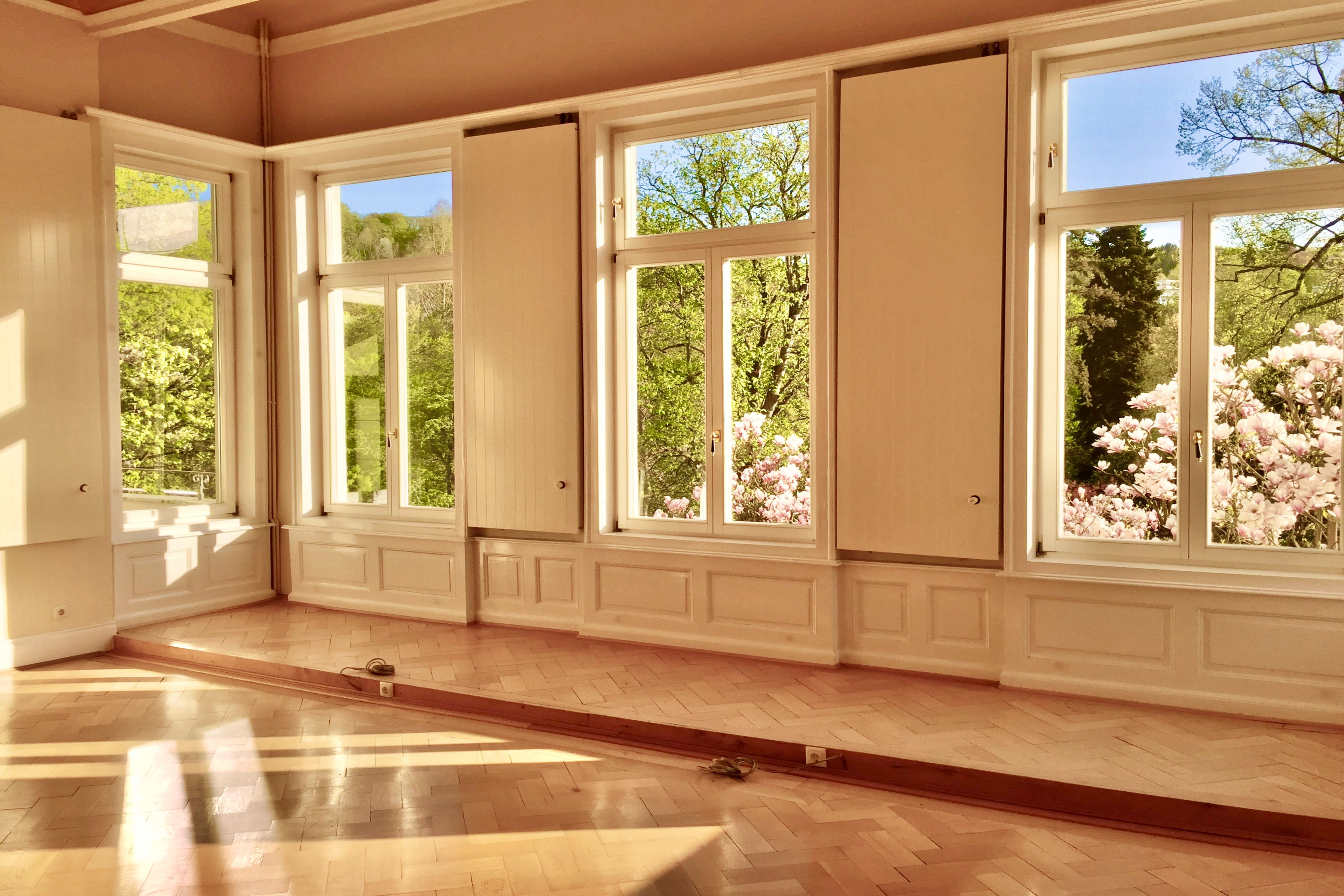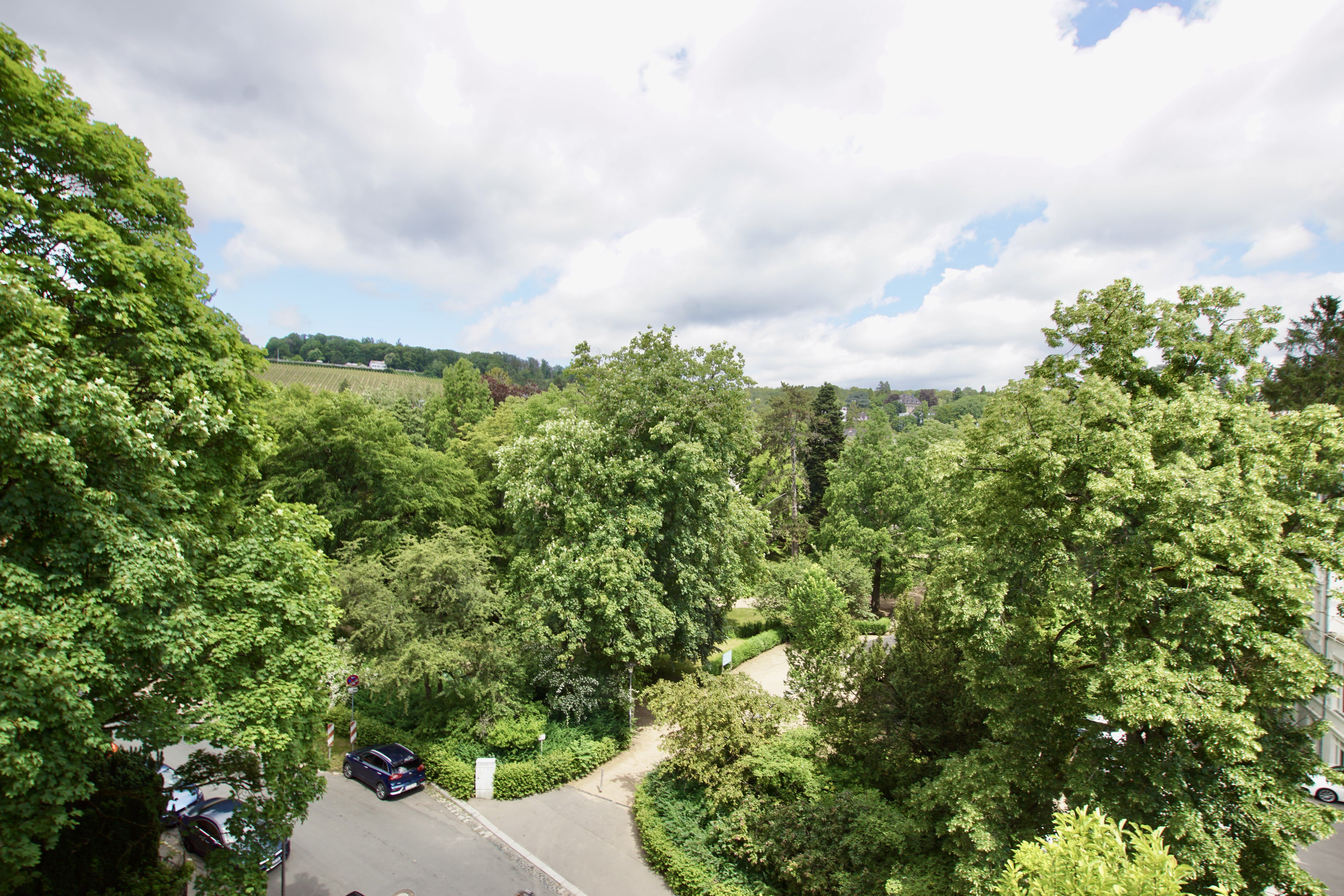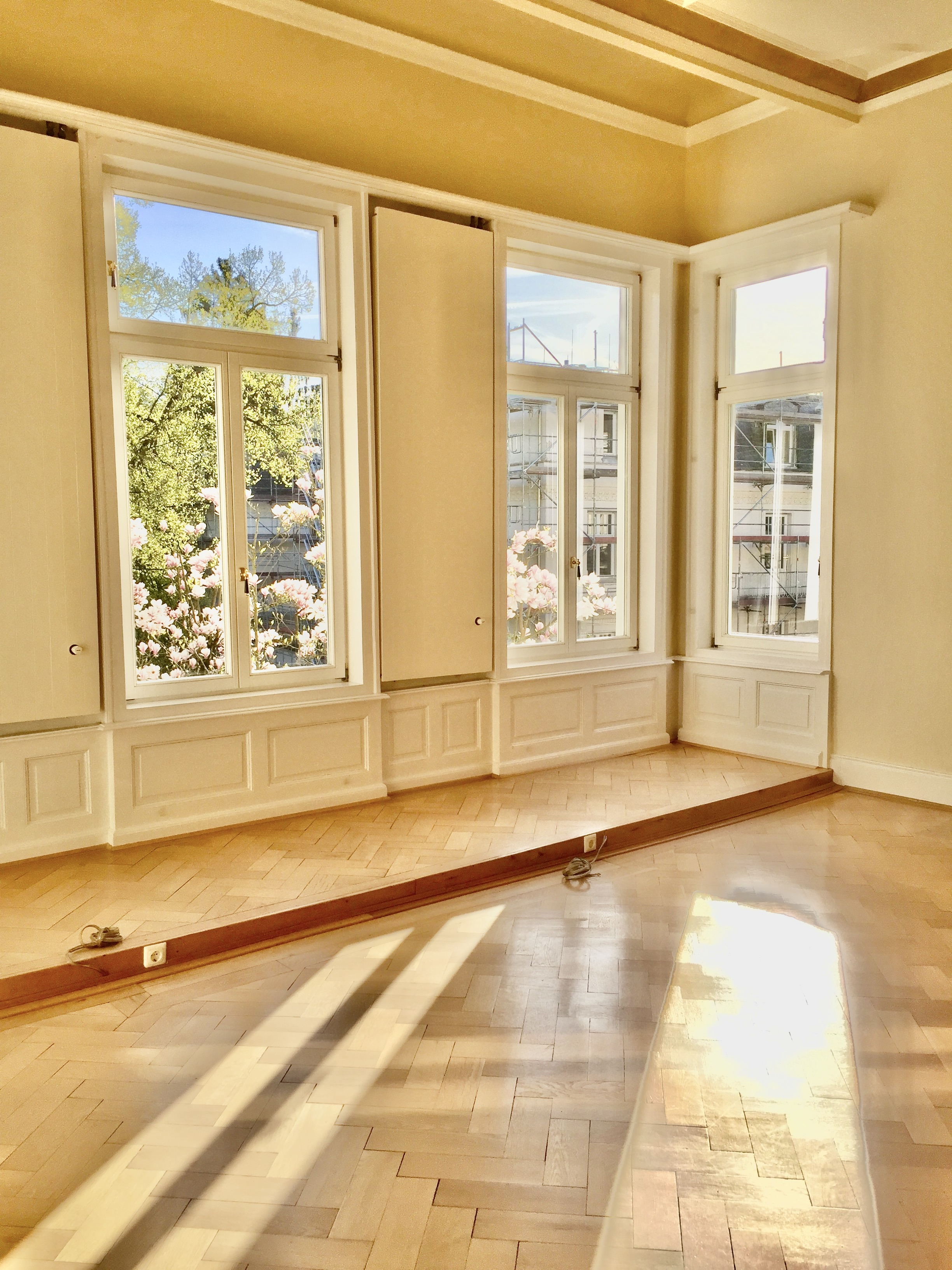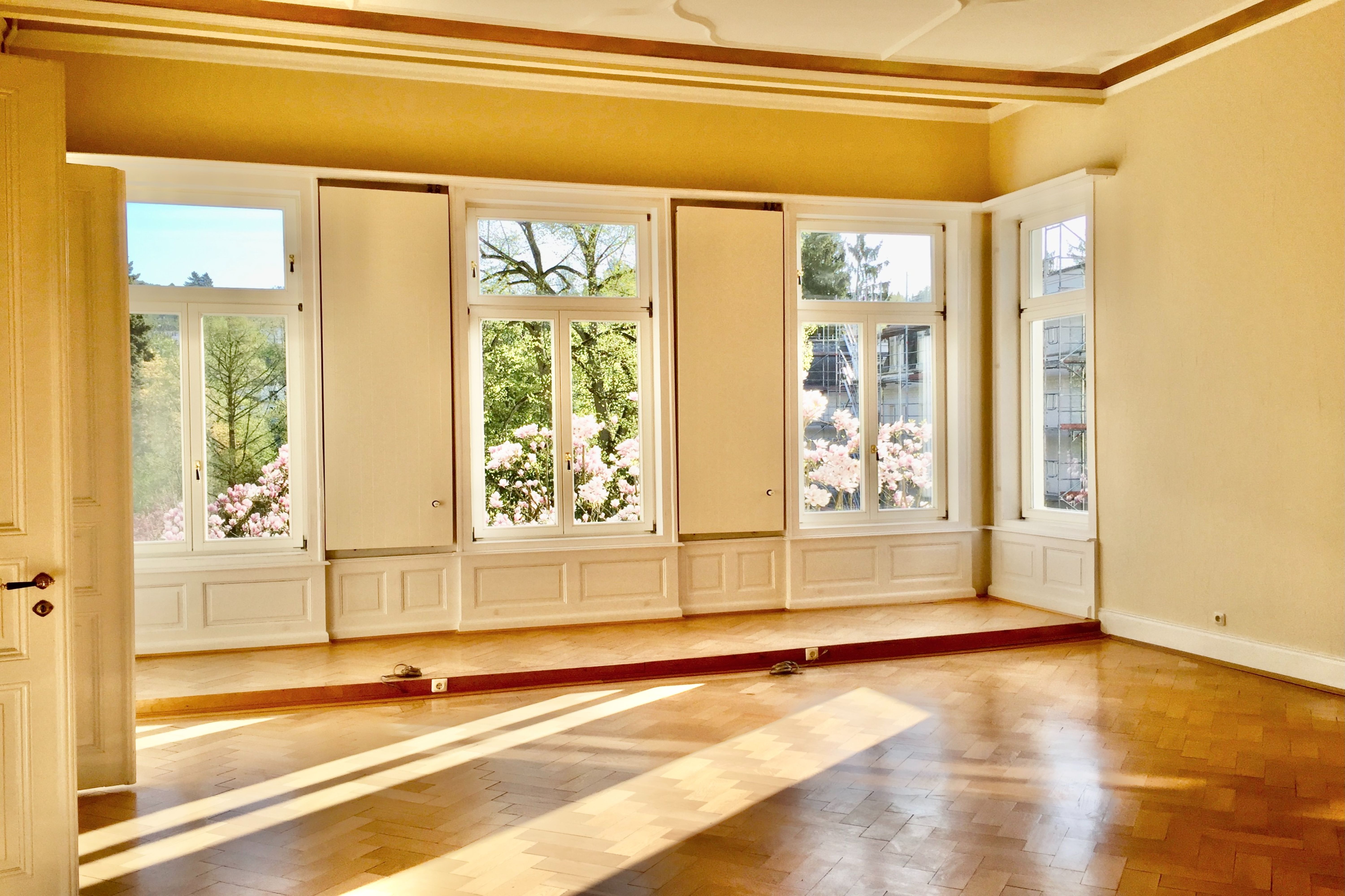 Zur Parkseite liegt der helle Wohnzimmerbereich mit großer Fensterfront. Das sich daran anschließende Arbeitszimmer hat direkten Zugang zum Balkon mit Morgensonne.