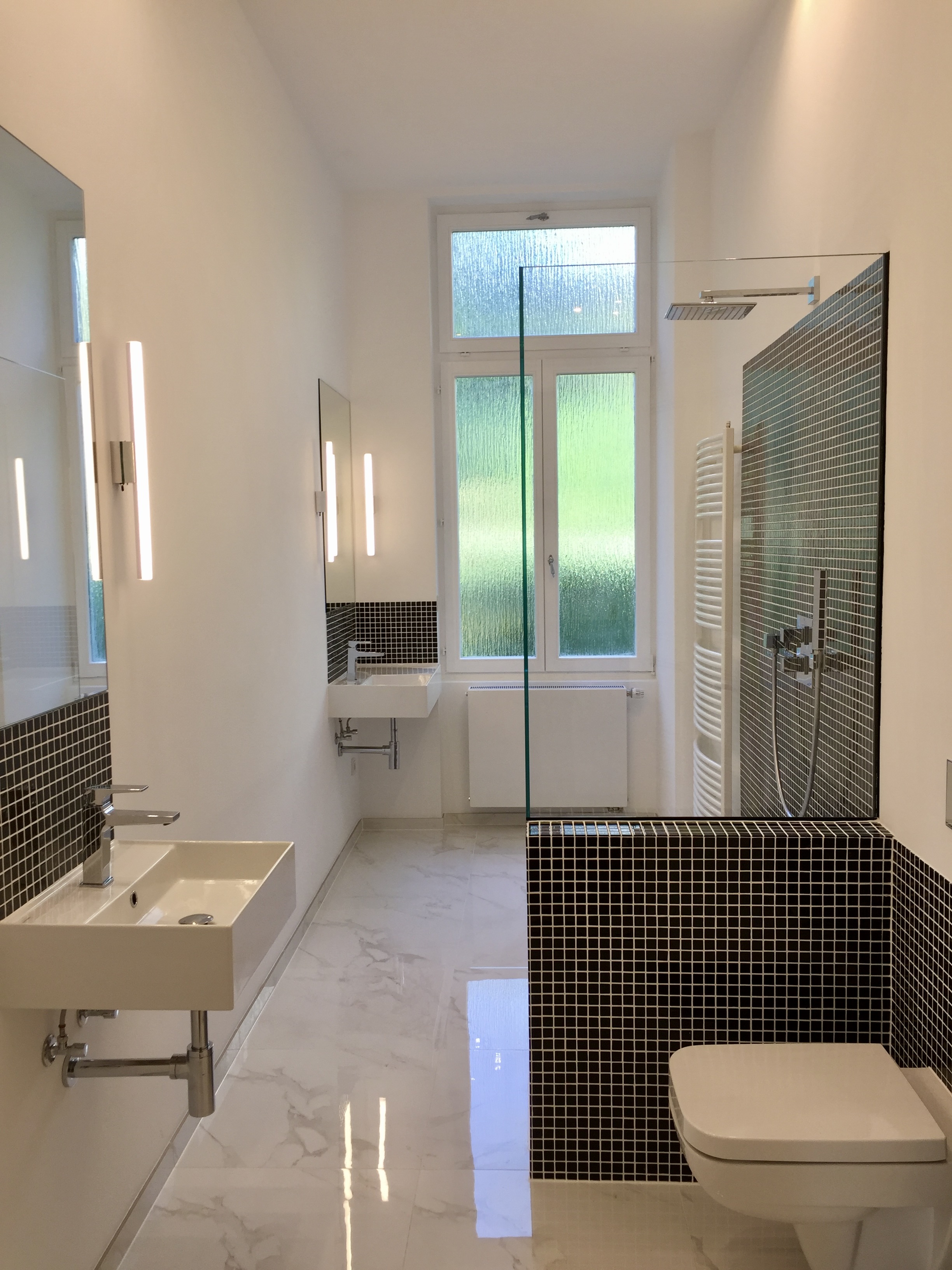 Zur Gartenseite liegt das weiße Tageslichtbad, die moderne Einbauküche, Schlafzimmer und Ankleide. Sowohl von der Küche als auch vom Schlafzimmer haben Sie Zugang zum großen Balkon mit direktem Gartenzugang.