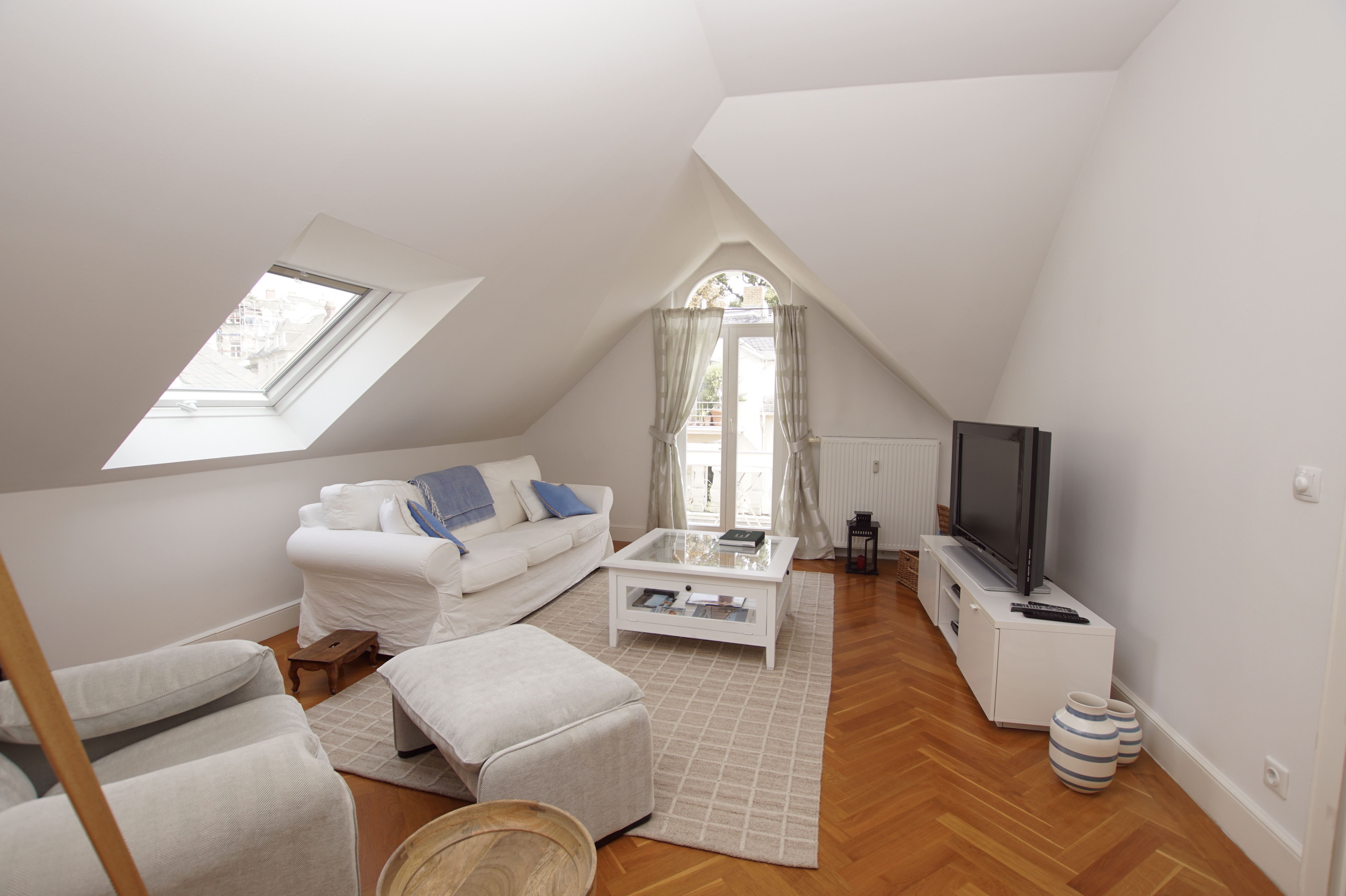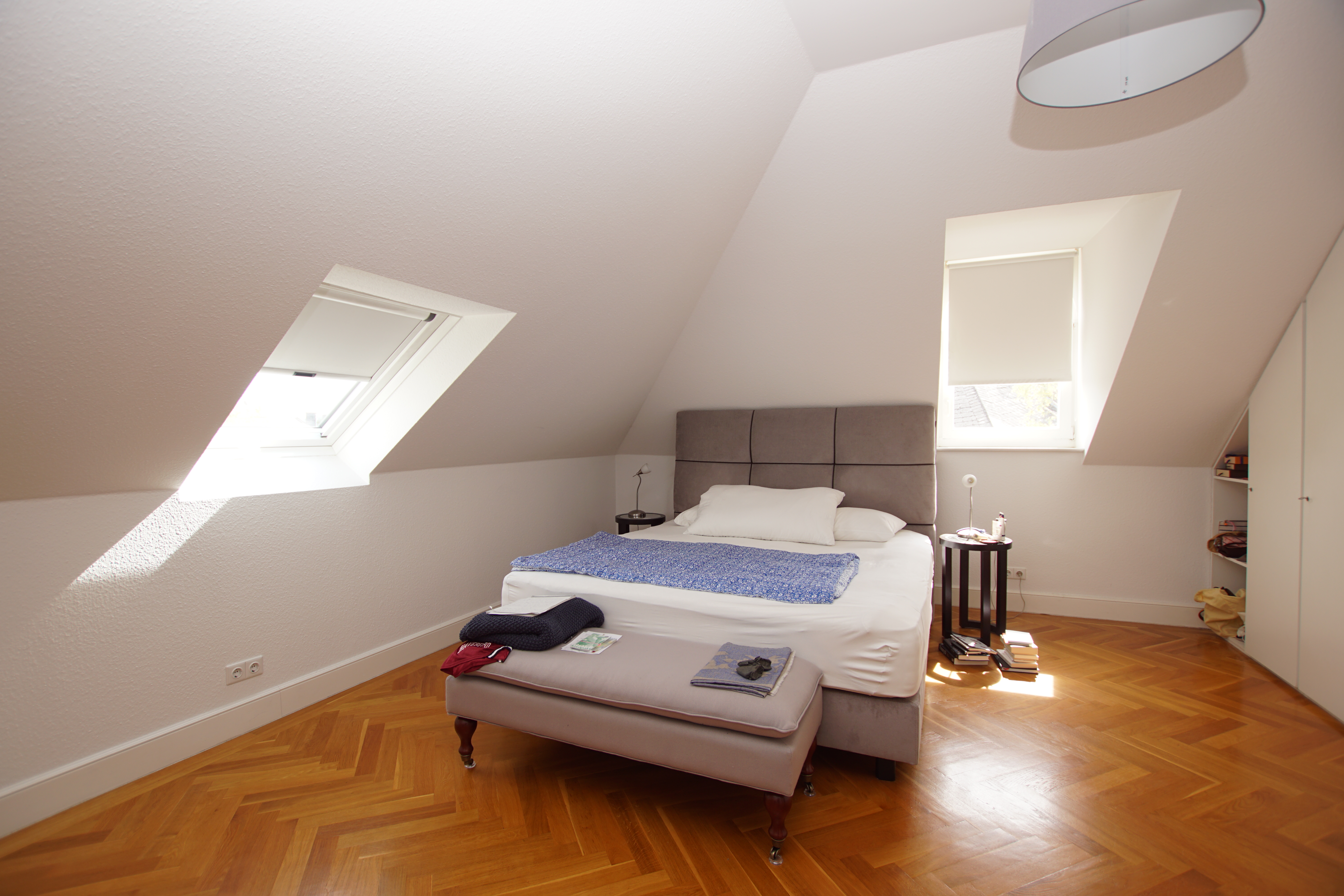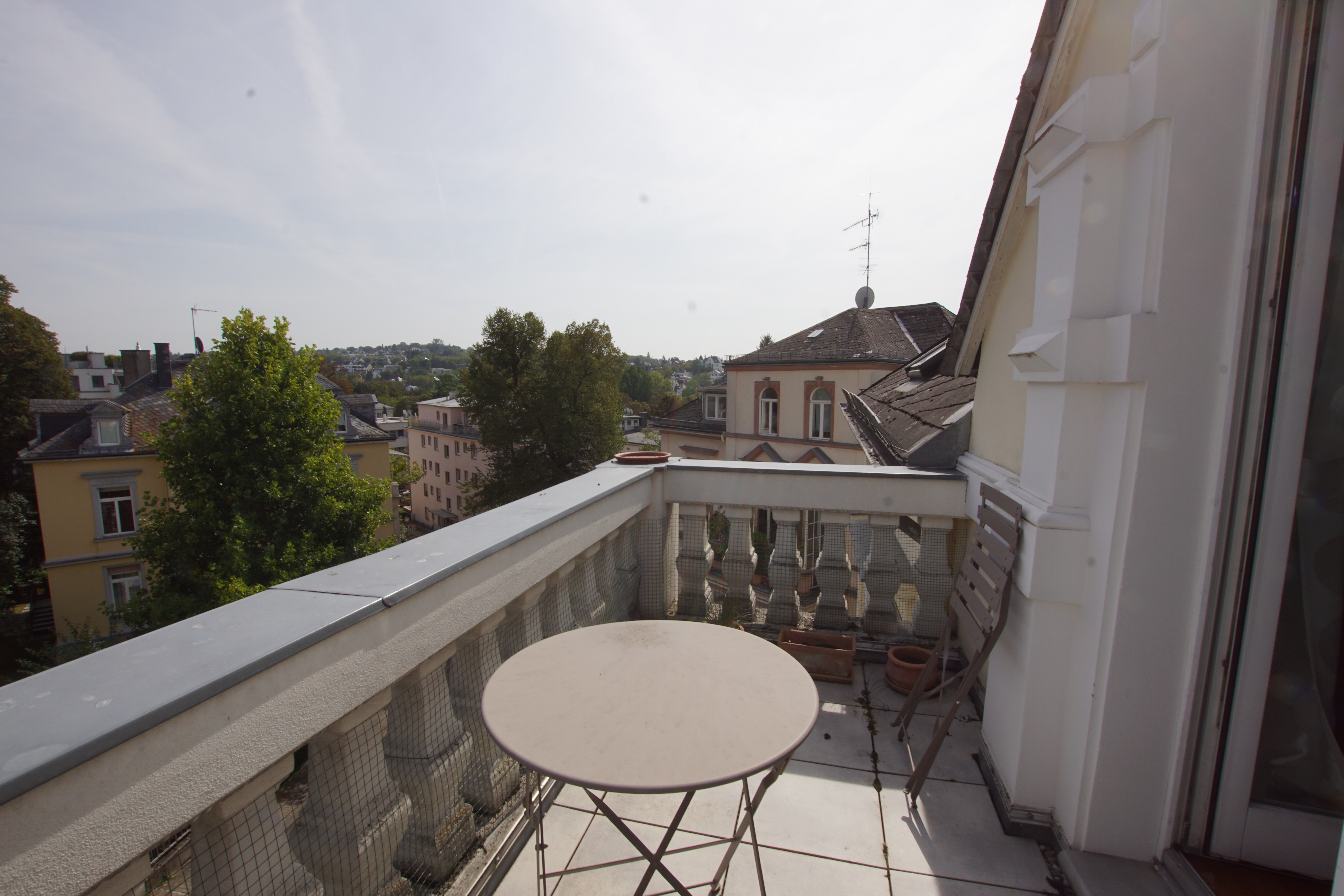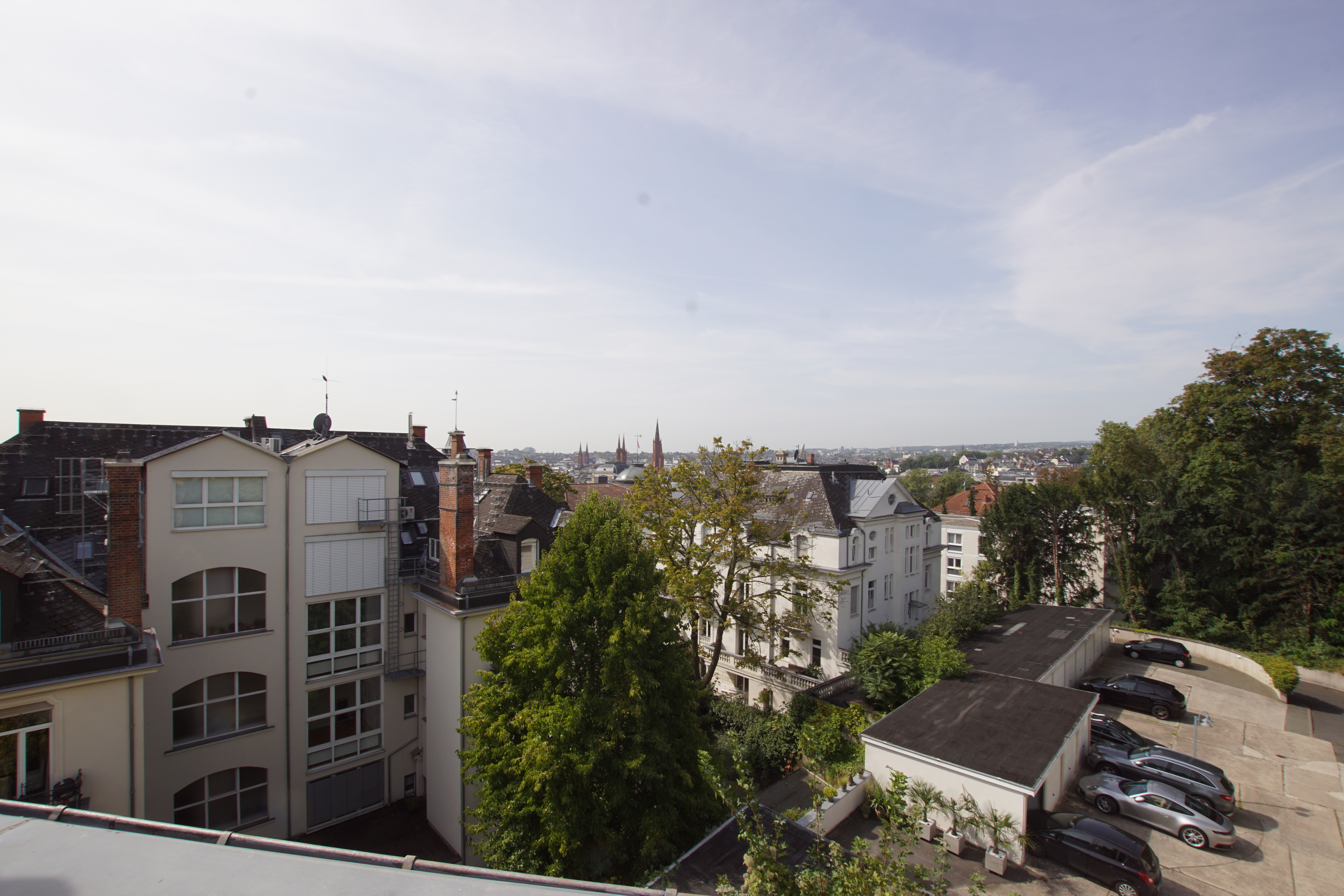 Blick über die Dächer der Stadt - hier wohnen Sie im Dachgeschoß einer denkmalgeschützten Villa in Bestlage von Wiesbaden. Die drei Parteien-Villa liegt in einer ruhigen Straße in Nähe des Kurparks.