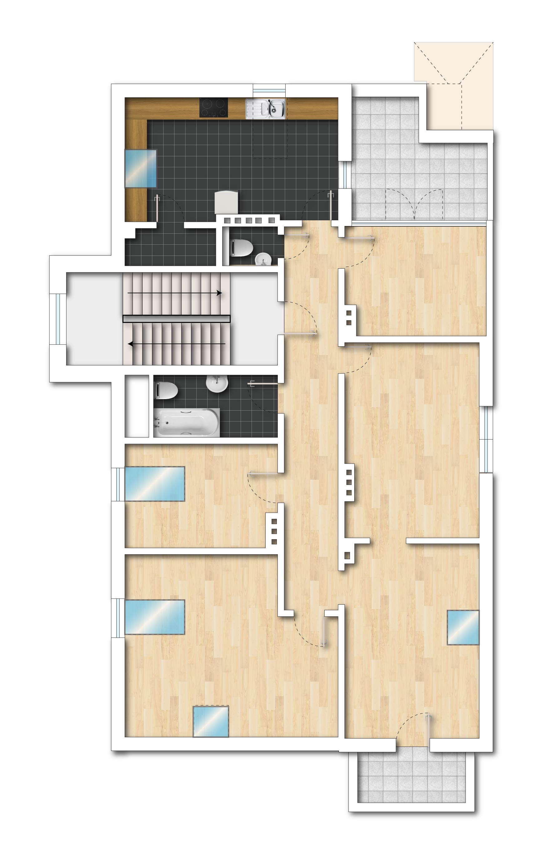 Über das helle Treppenhaus gelangen Sie im 2. Obergeschoß in den großzügigen Flur, von dem aus Sie alle Zimmer begehen können. Neben 2 Schlaf- und einem Arbeitszimmer ist der Wohn-Essbereich offen gestaltet. Eine Einbauküche, ein Gäste-WC sowie ein großzügiges Tageslichtbadezimmer sind vorhanden. Highlight sind die zwei Balkone mit einem traumhaften Blick über die Stadt.
