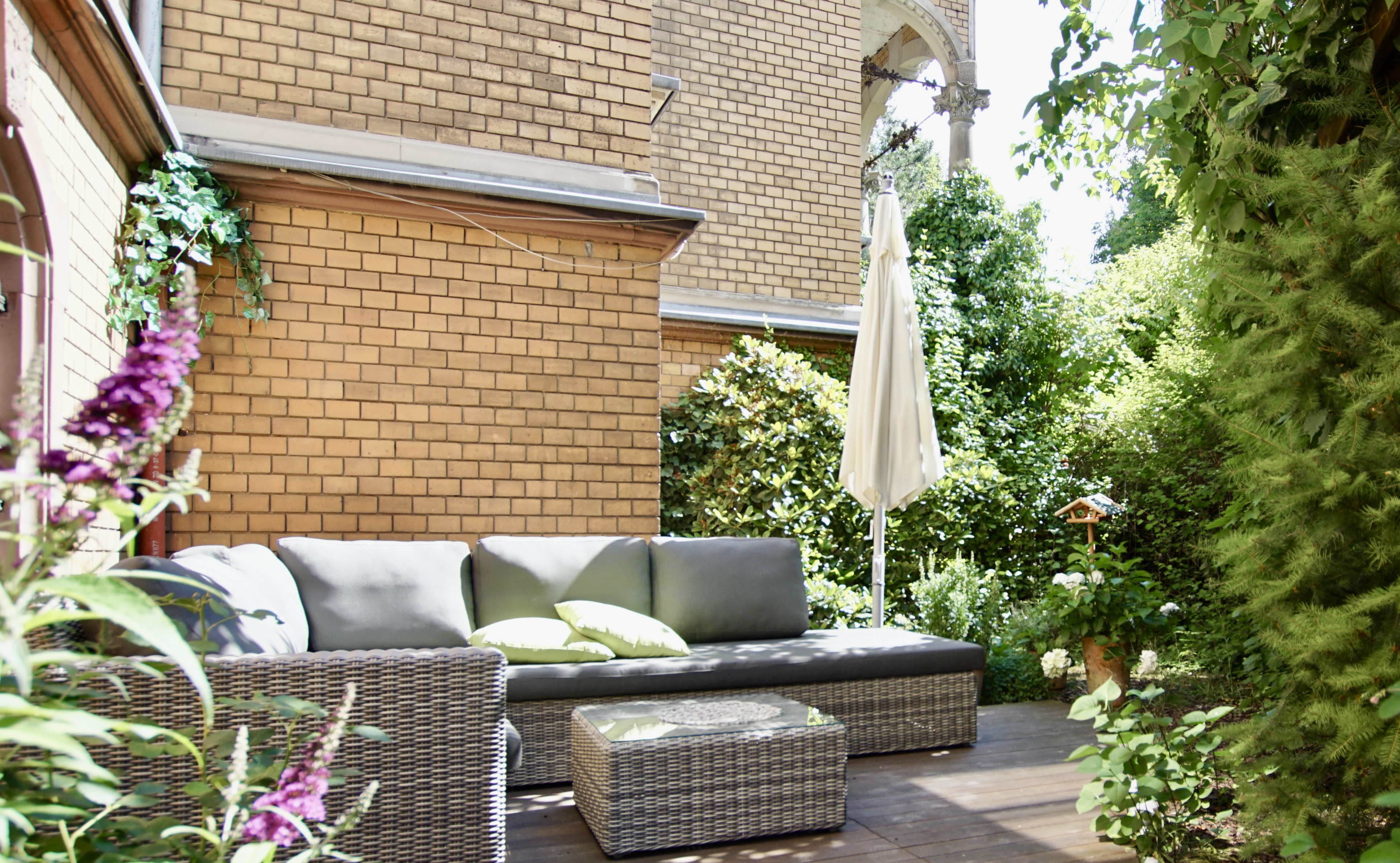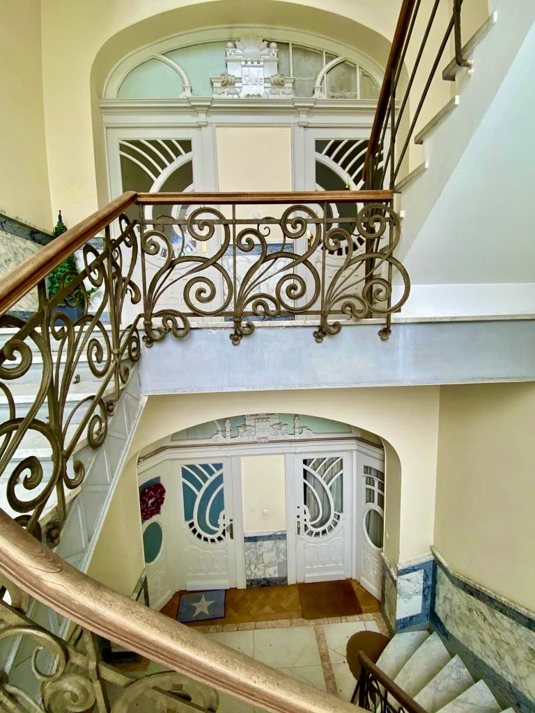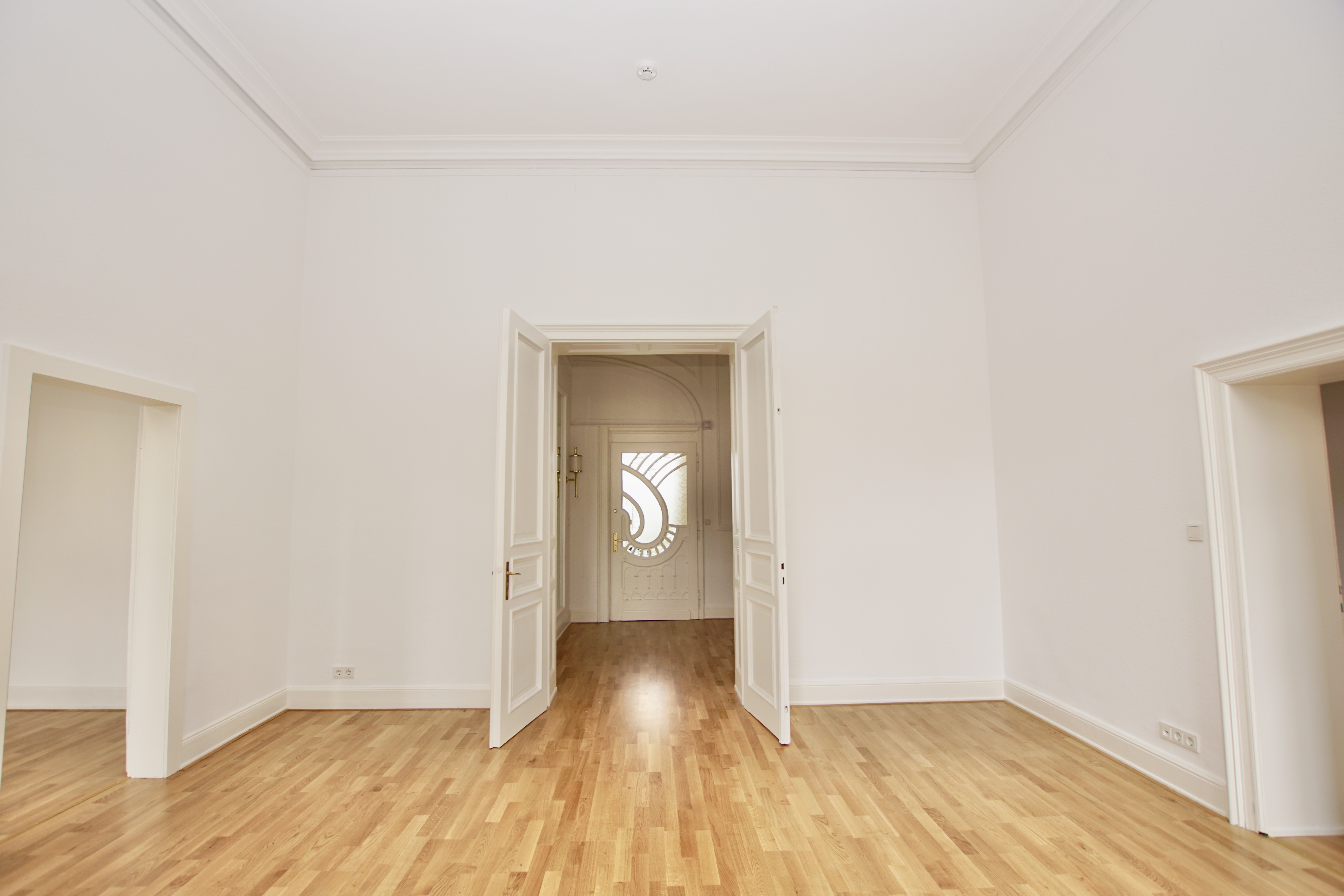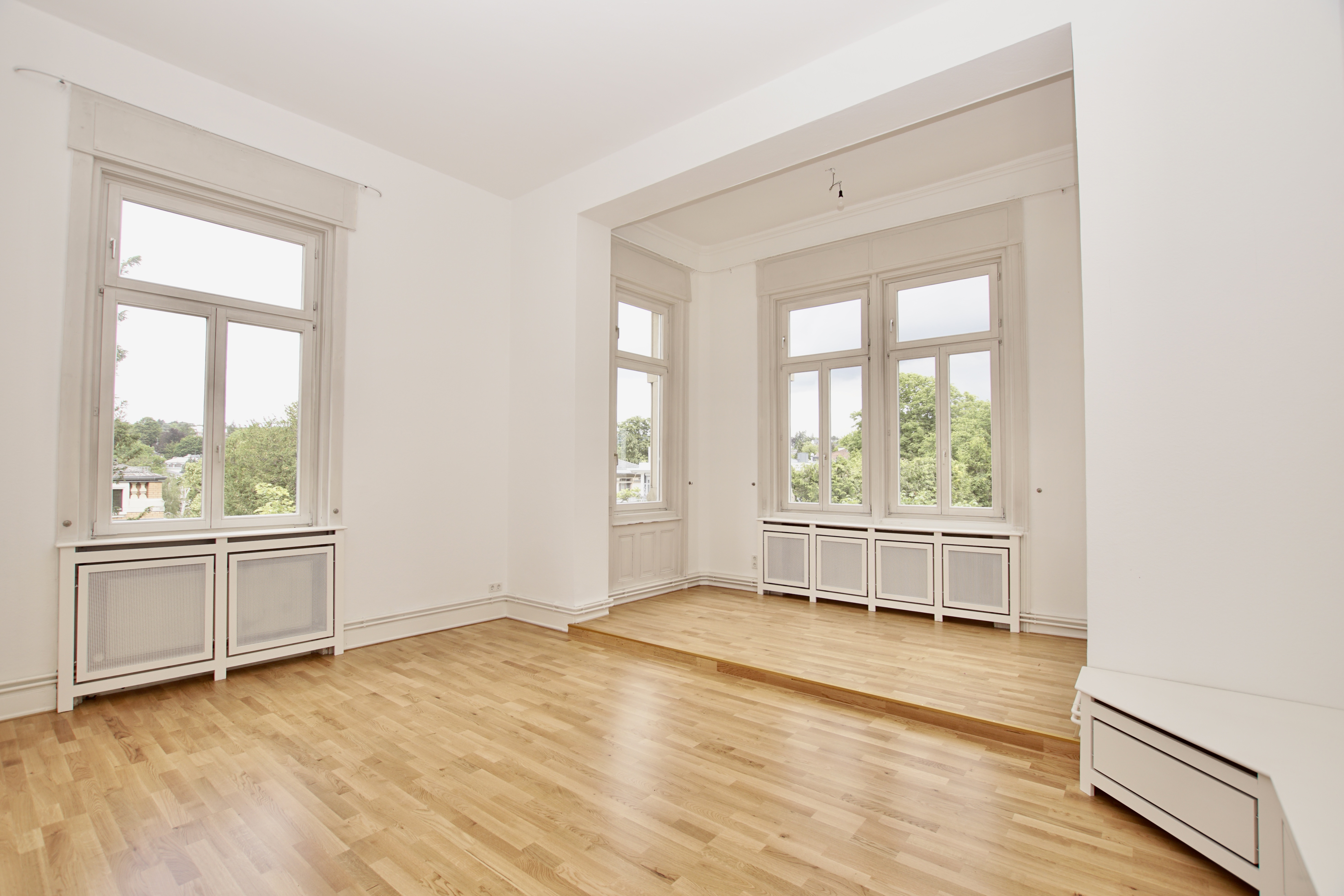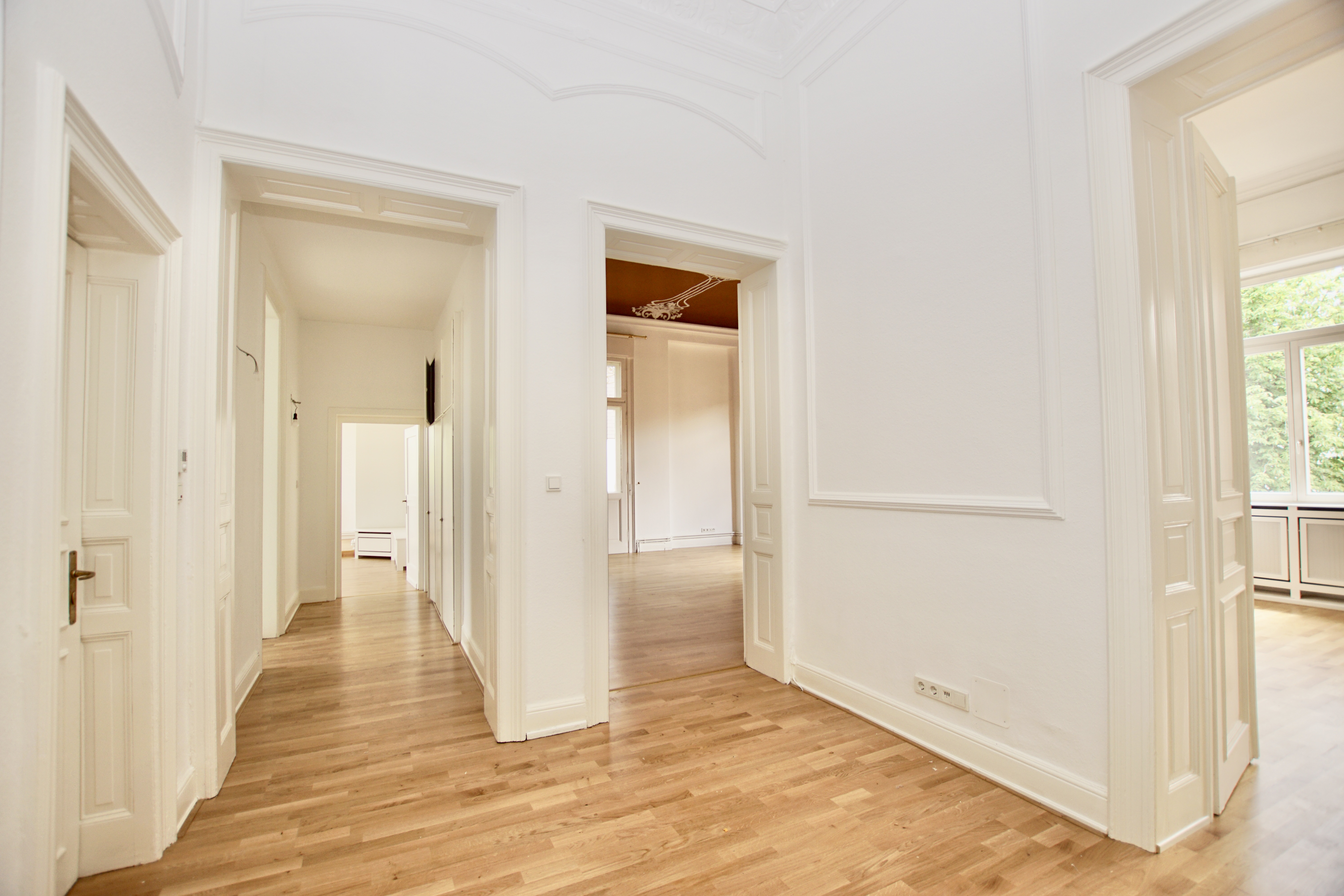 Der Wohnbereich der vermieteten Villa zieht sich über vier Etagen. Zwei Kellerebenen sowie der in Stellplätze aufgeteilte Innenhof ergänzen das Angebot. Jede der Wohnungen verfügt über einen Außenbereich oder einen historischen Wintergarten.