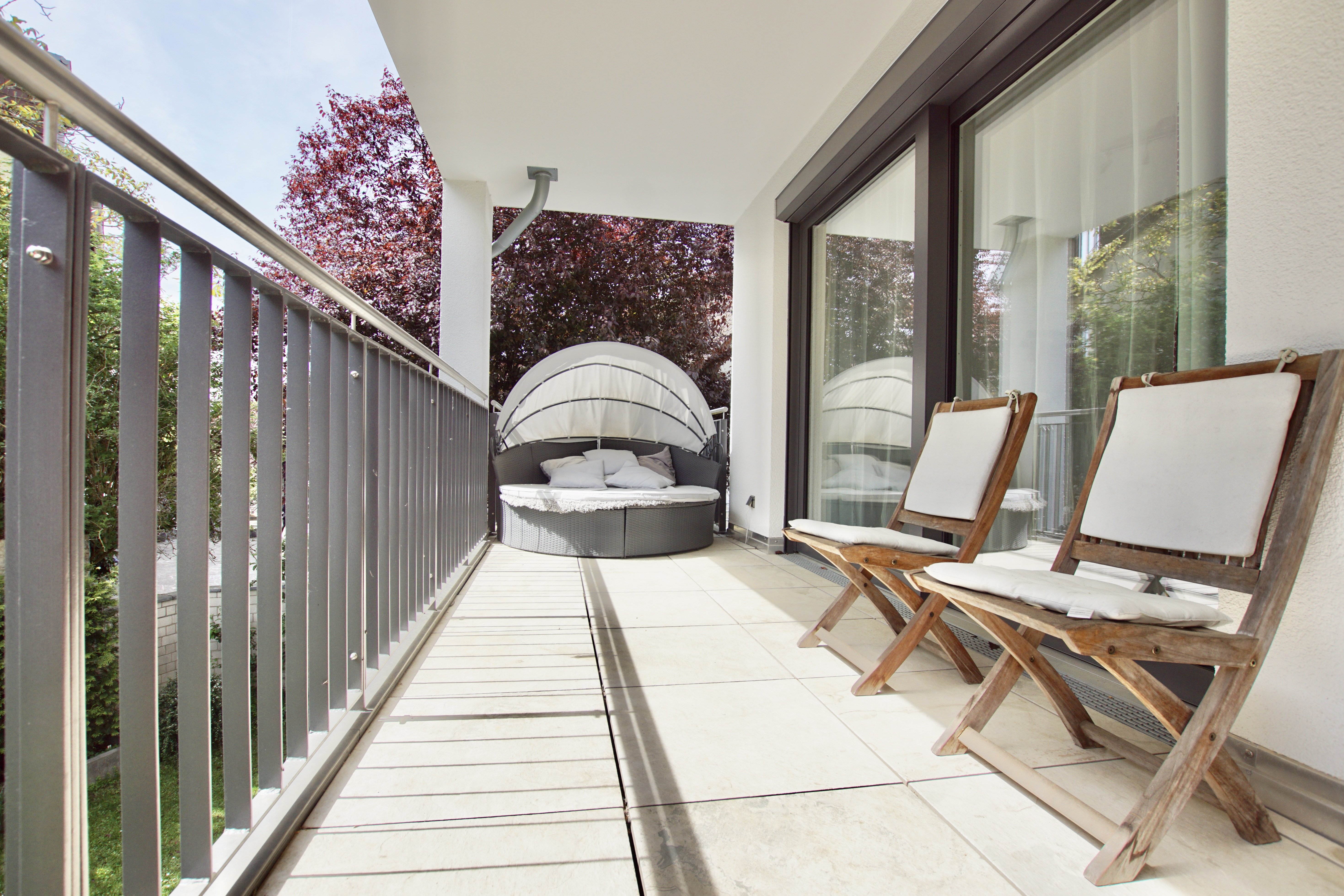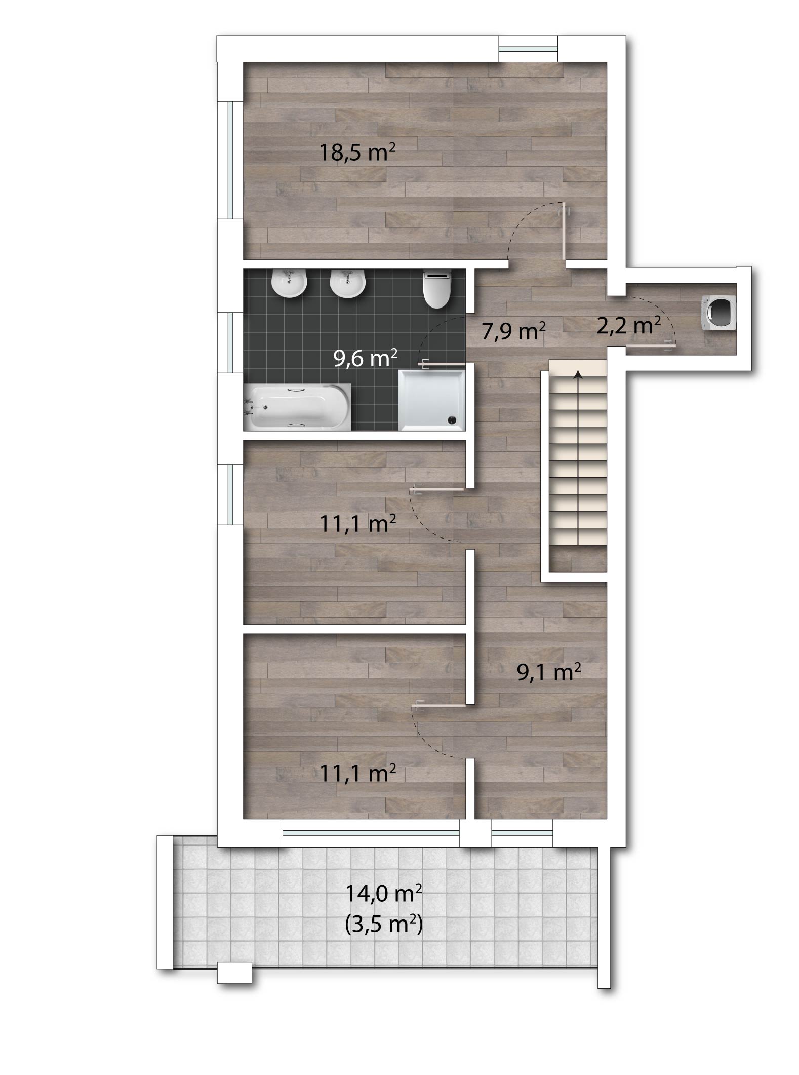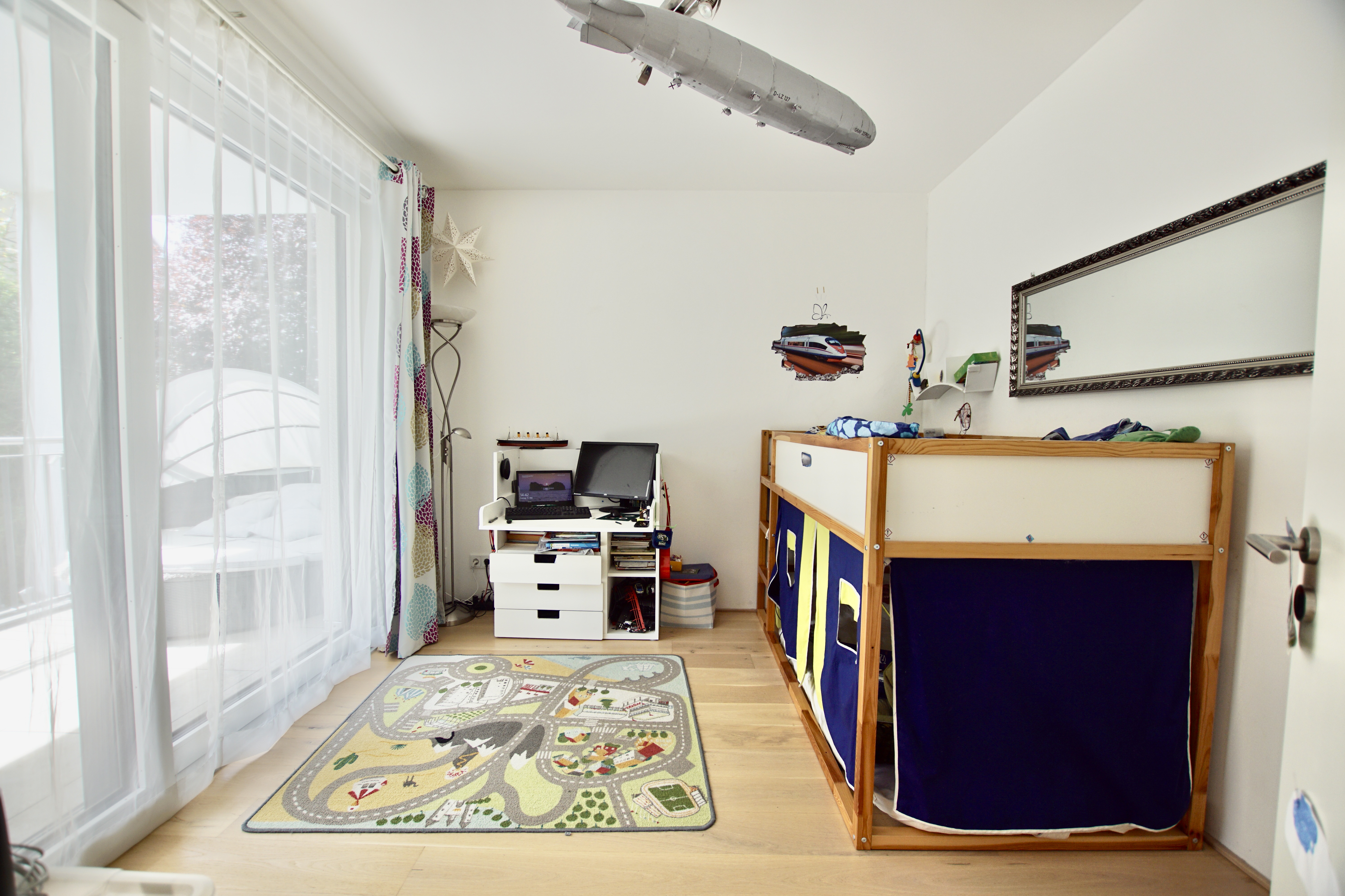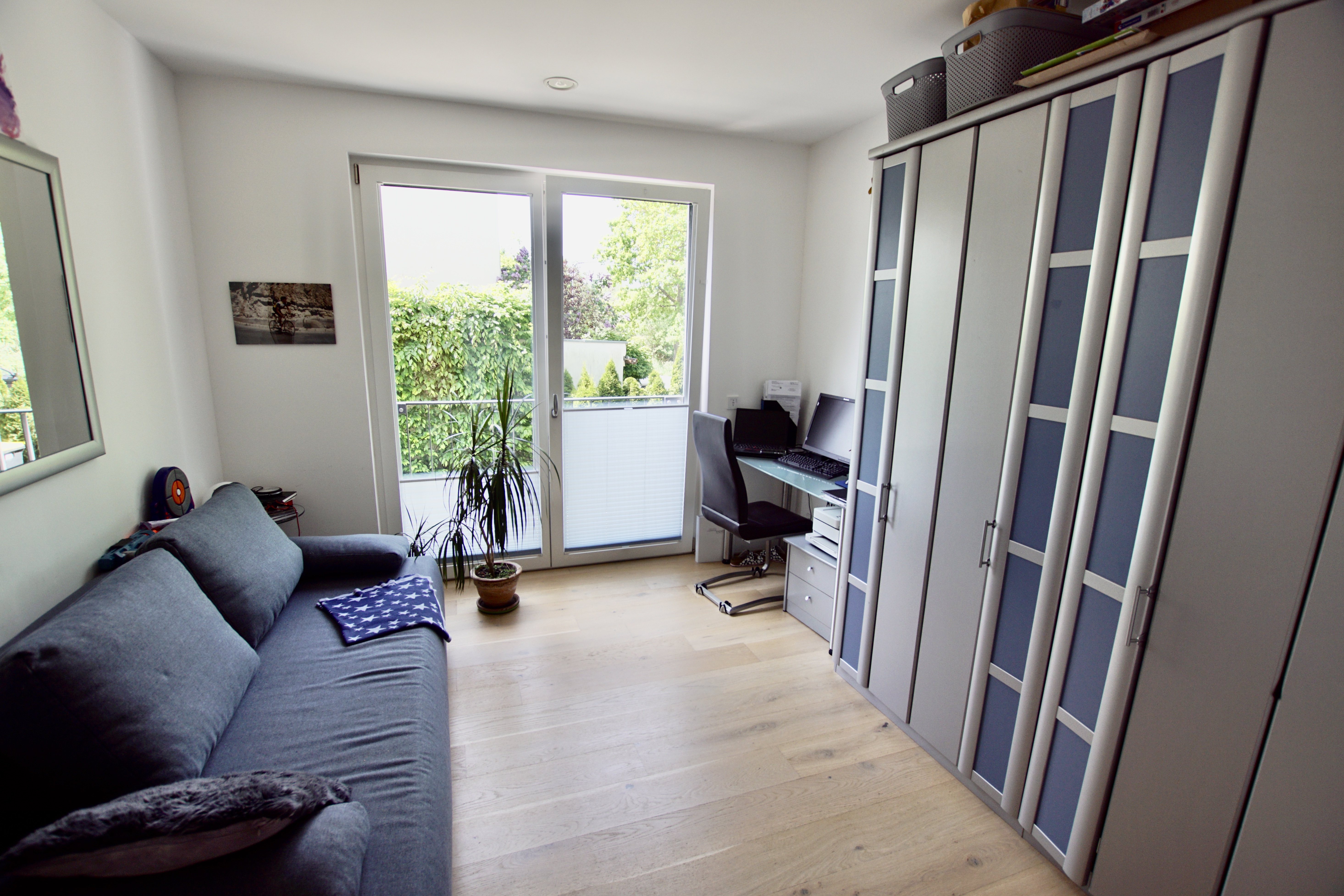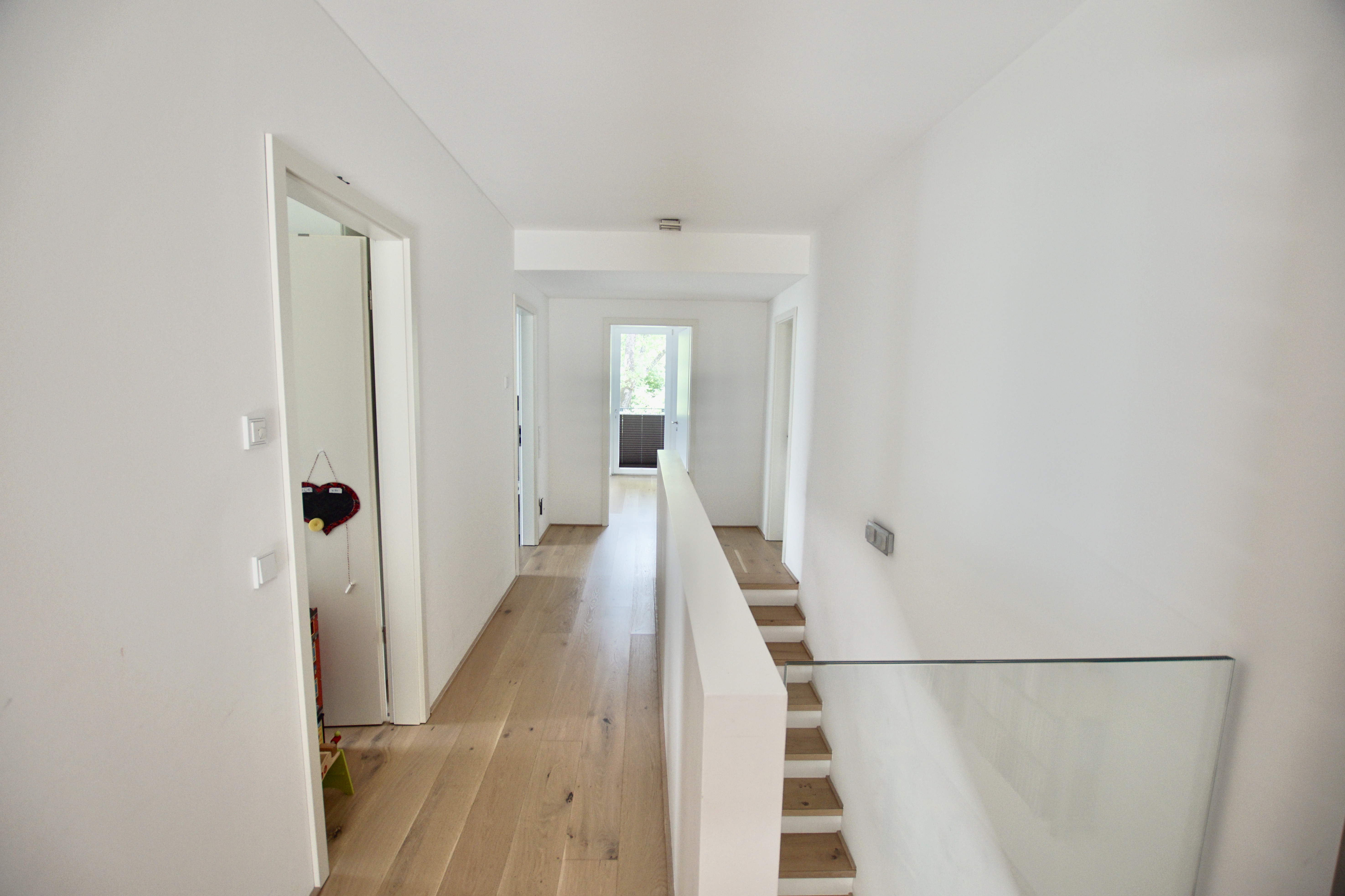 Über die interne Treppe gelangen Sie in die obere Etage mit drei Schlafzimmer, dem hellen Tageslicht-Masterbad mit Wanne und Dusche und dem Zugang zum großen Sonnenbalkon mit Blick in den Garten.