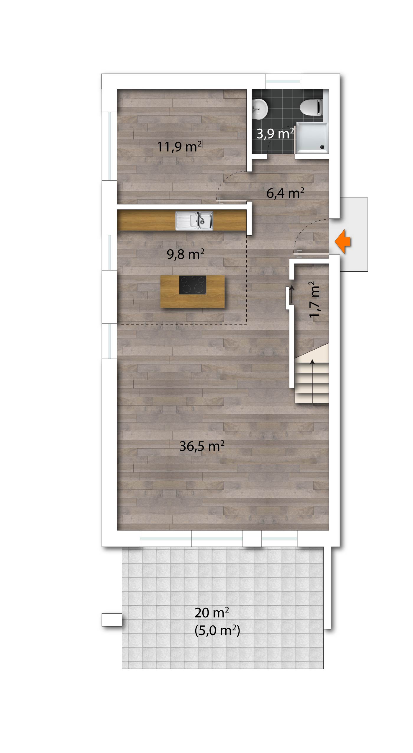 Beim Betreten der Wohnung eröffnet sich direkt der großzügige Wohn-Essbereich mit offener Einbauküche, bodentiefen Fenstern sowie dem Zugang zur Terrasse und dem eingewachsenen Südgarten. Ein helles Tageslichtbad sowie ein Schlafzimmer- bzw. Arbeitszimmer ergänzen das Wohnangebot auf dieser Ebene.