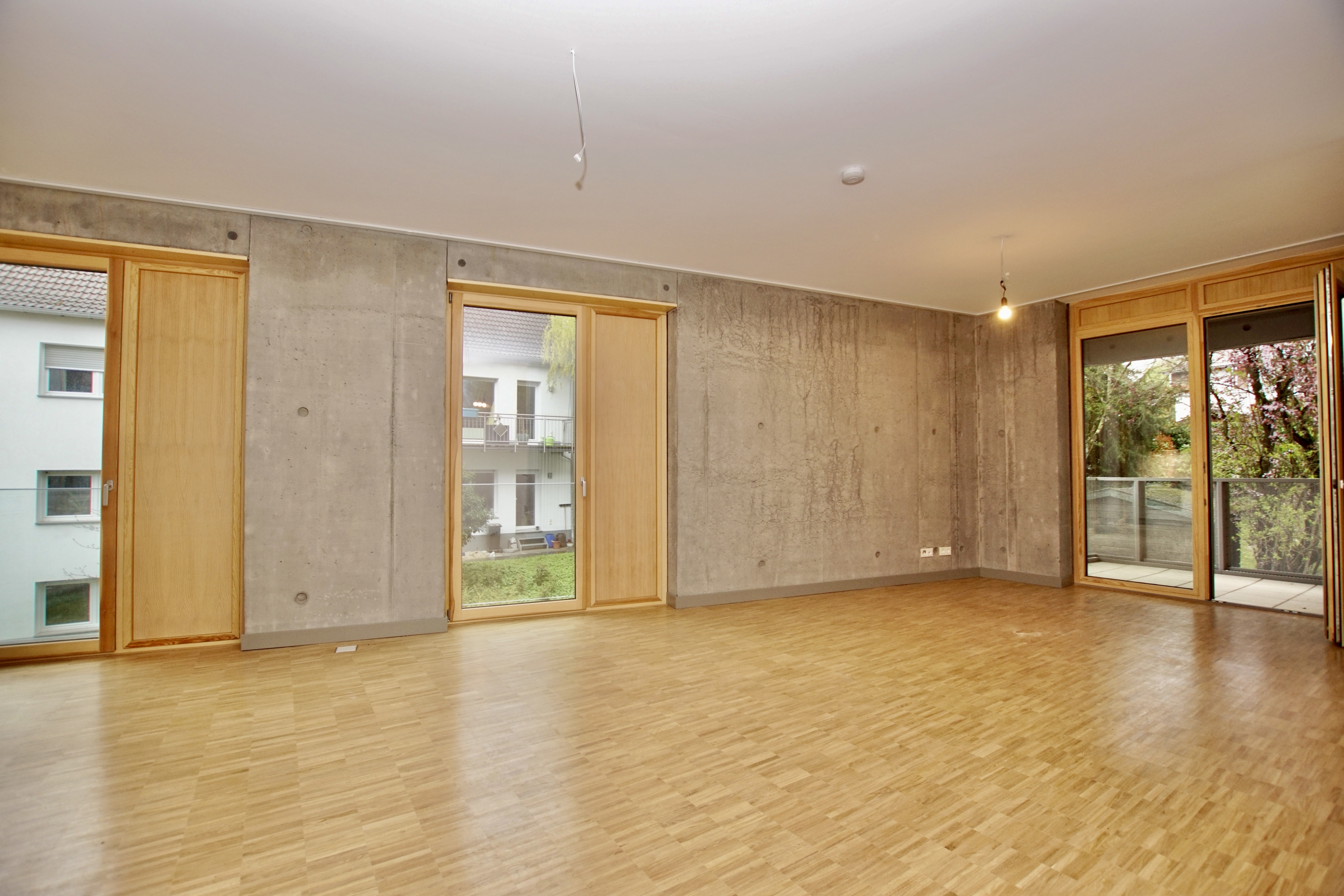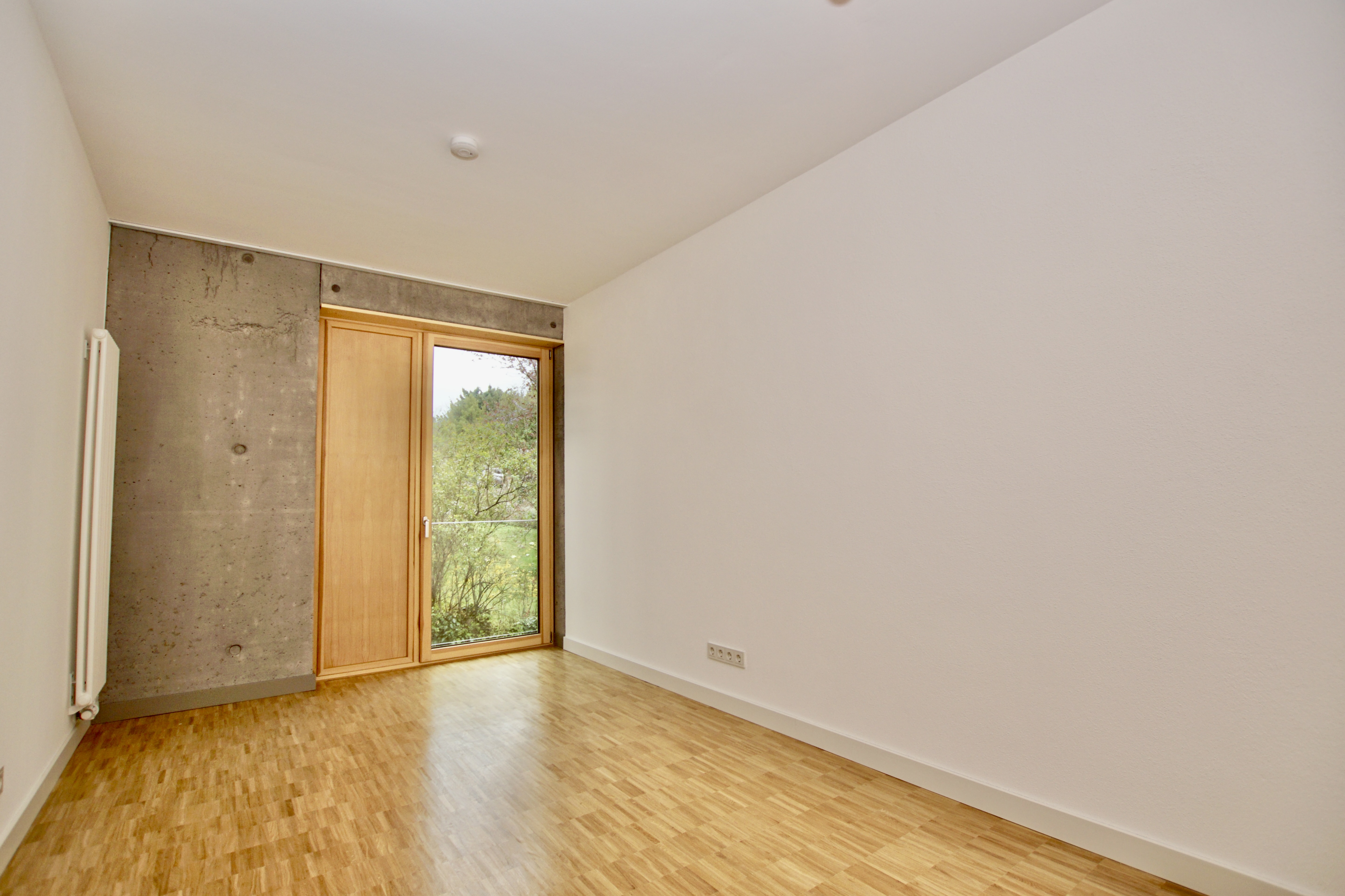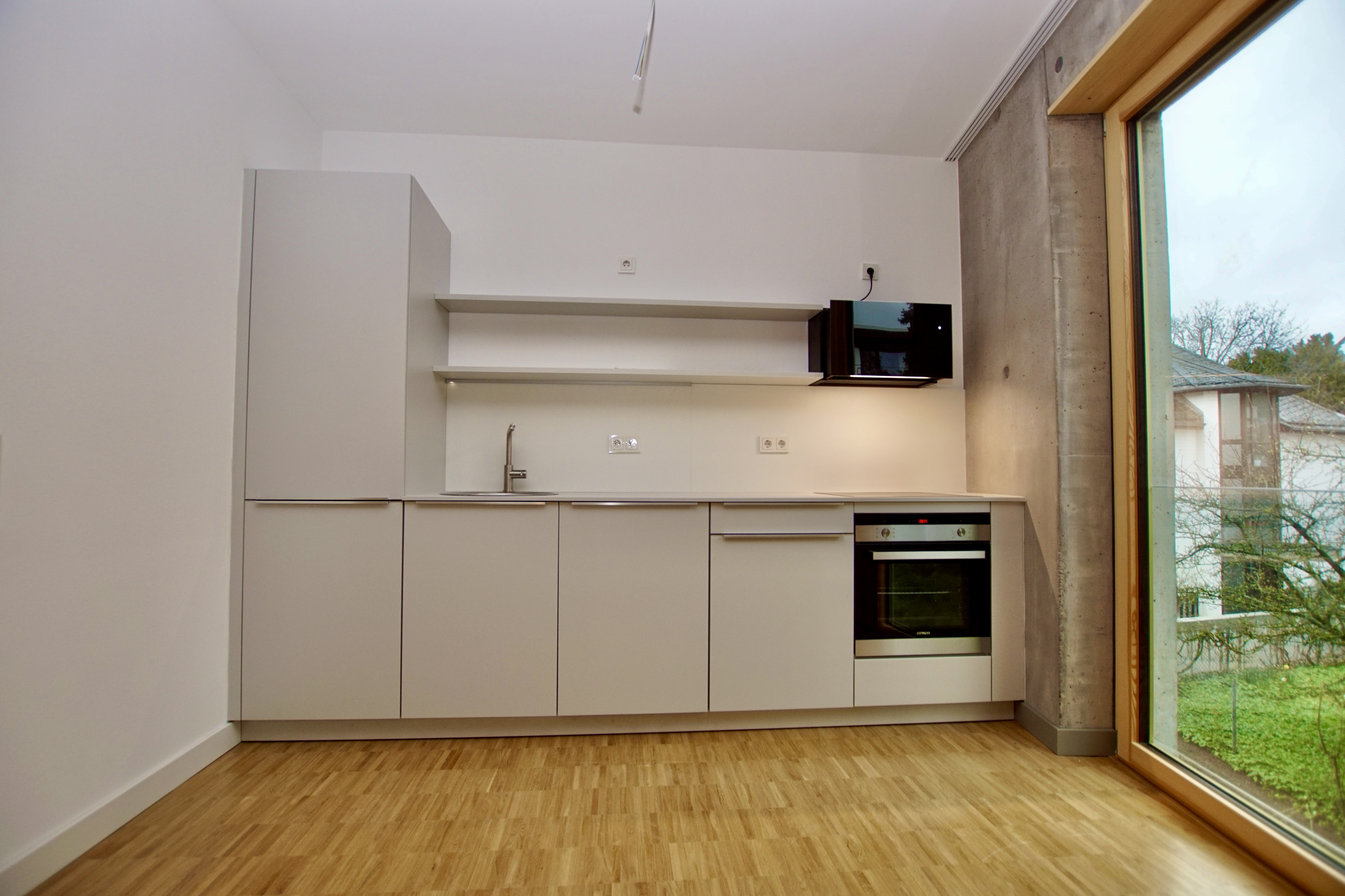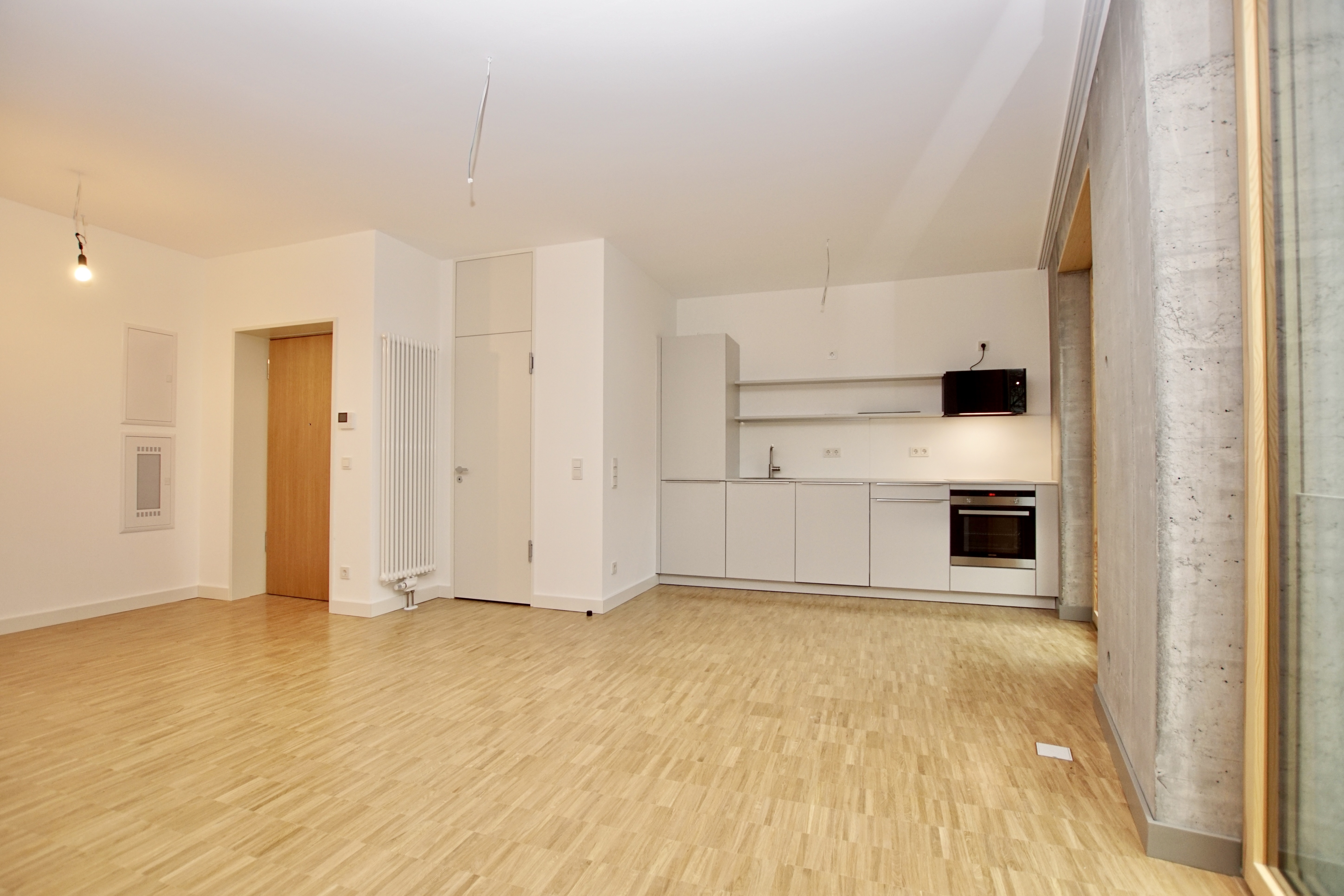 Die im Frühjahr 2022 fertiggestellte Wohnung im 1. Obergeschoß eines modernen Mehrparteienhauses aus stylischem Sichtbeton, bietet mit seinem charmant geschnittenen Grundriss das ideale Zuhause für Singles und Paare.