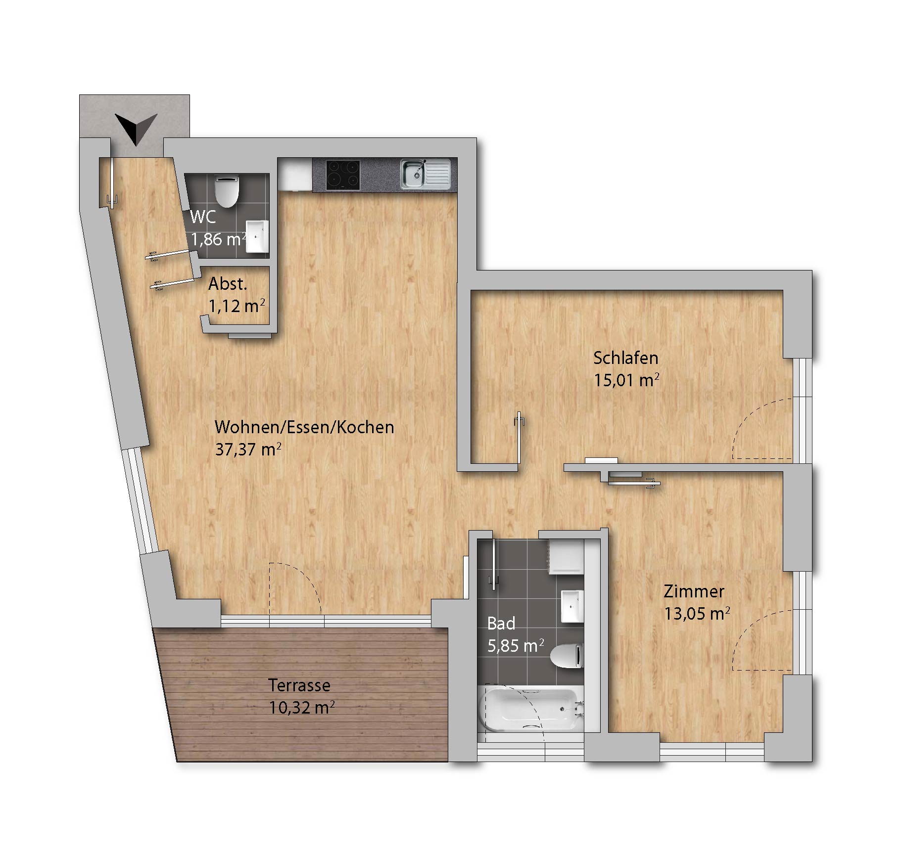 Herzstück der Wohnung ist der helle, großzügige Wohn-Essbereich mit offener Einbauküche. Von hier aus gelangen Sie direkt auf die Südterrasse mit kleinem Gartenanteil. Neben einem Tageslichtbad mit Badewanne wird das Wohnangebot durch eine separate Gäste-Toilette ergänzt.