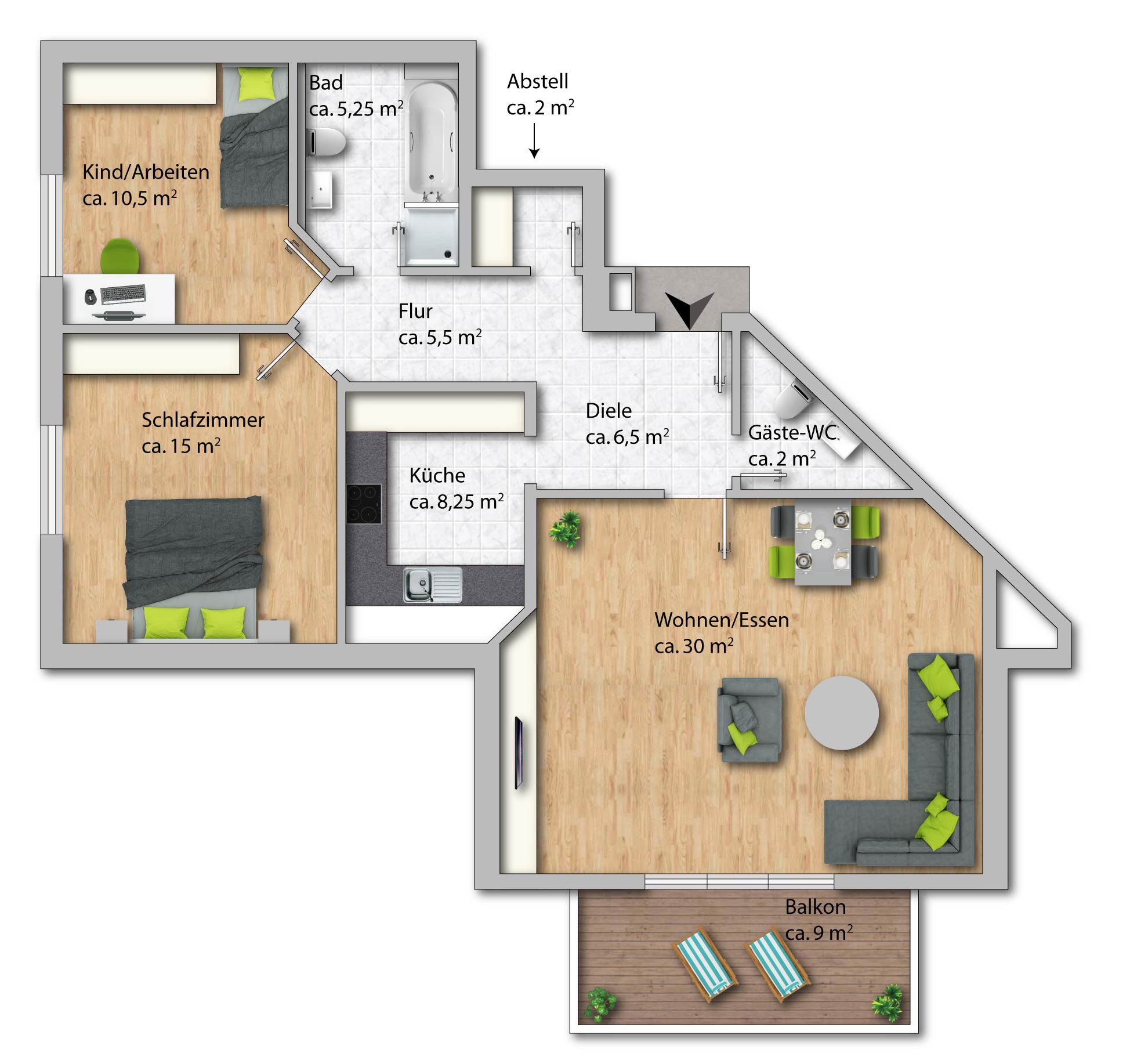 Der Schnitt mit großem Wohn-Essbereich, zwei Schlafzimmern, Einbauküche, Tageslichtbad und Gäste-WC ist ideal für Paare und Familien. Vom Wohn-Esszimmer aus gelangen Sie auf den schönen Südbalkon mit Markise von dem Sie einen wunderbaren Fernblick haben.