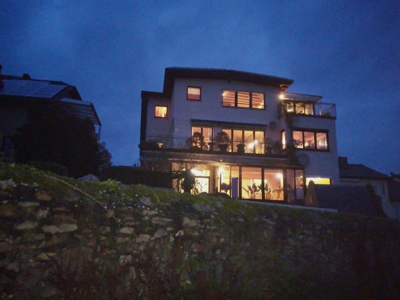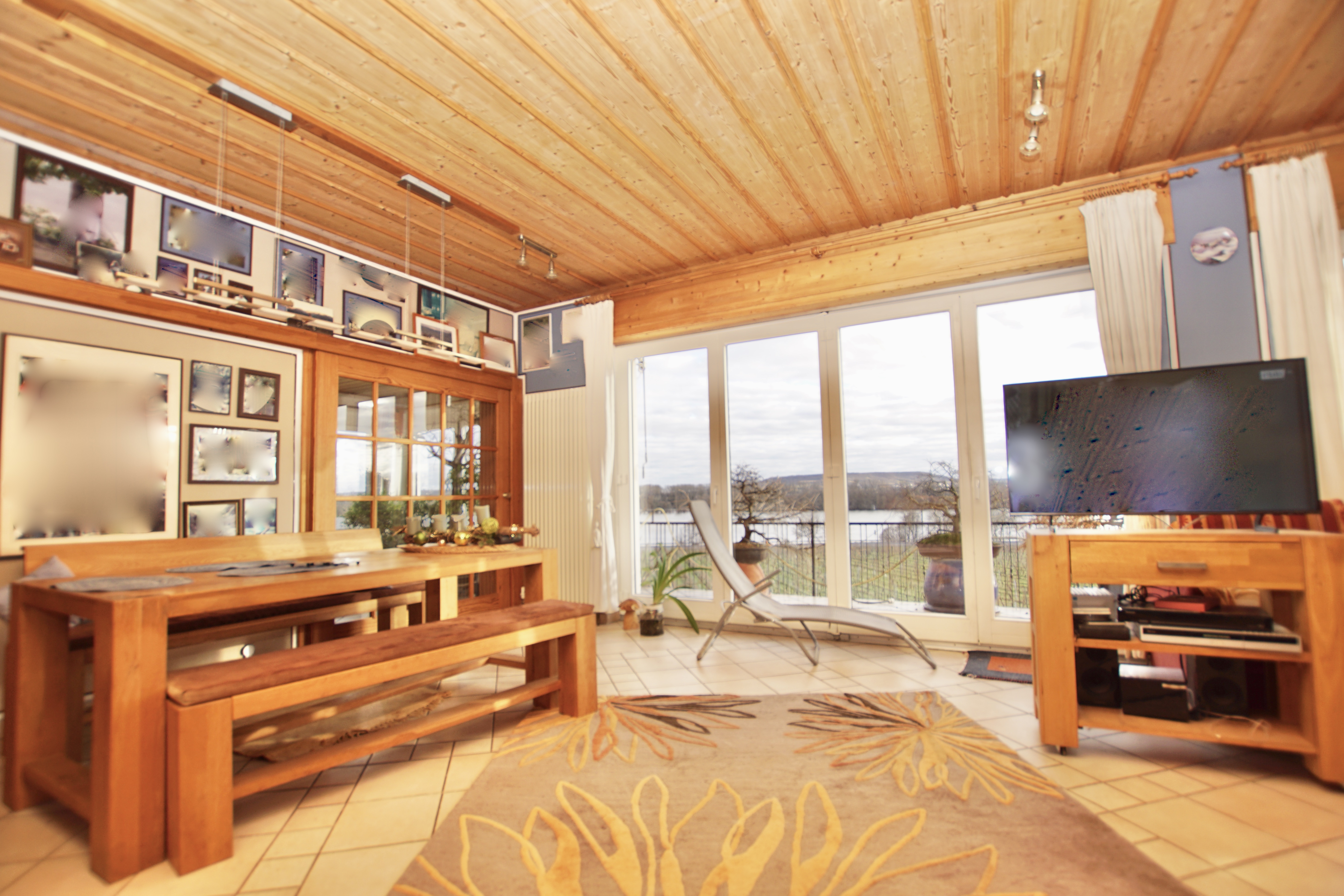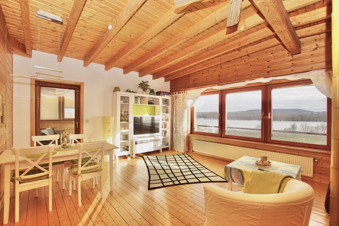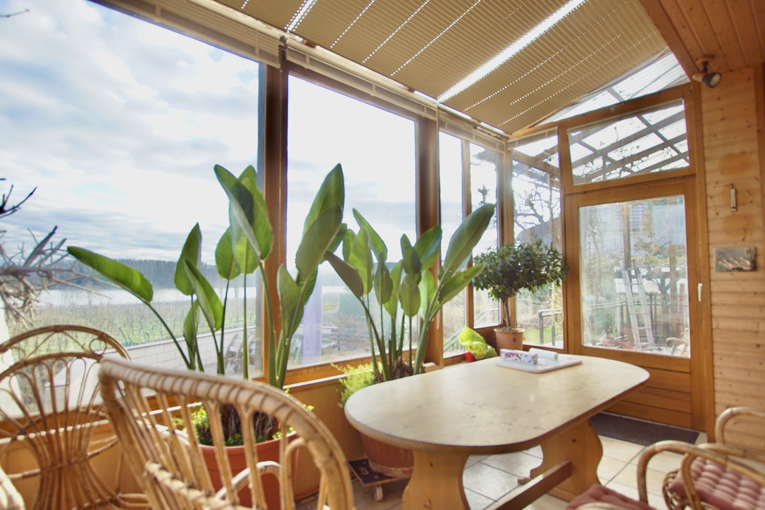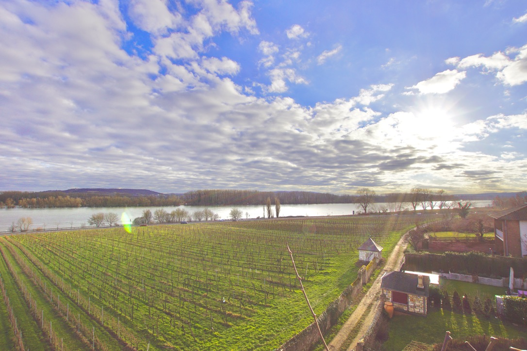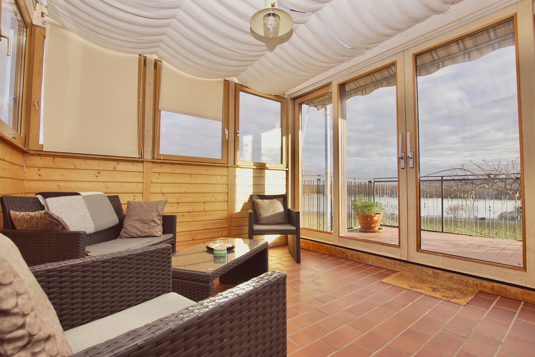 Von der großzügigen Südterrasse hinter dem Haus genießen Sie den traumhaften Blick auf den Rhein, ebenso von den Balkonen in den darüber liegenden Etagen.