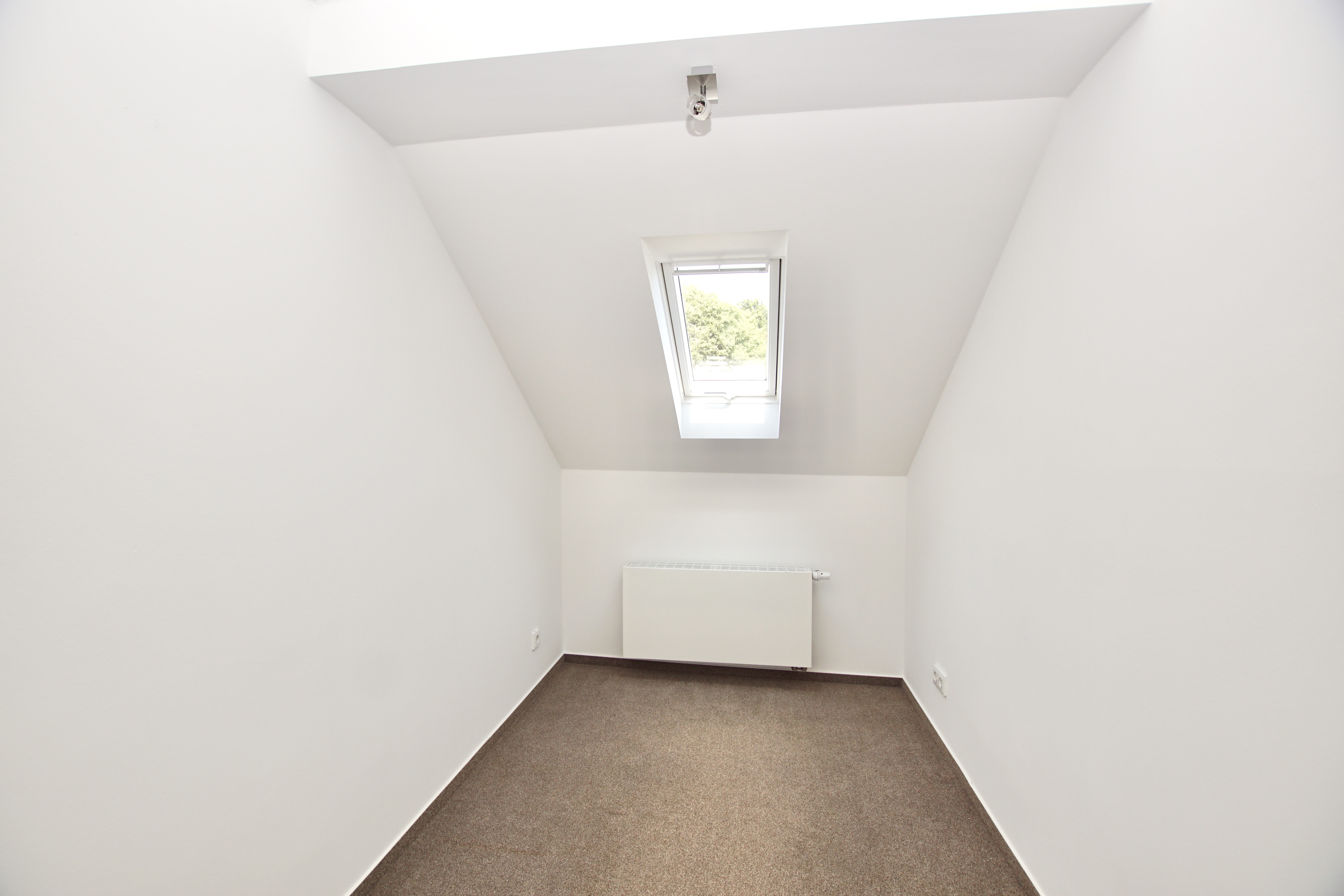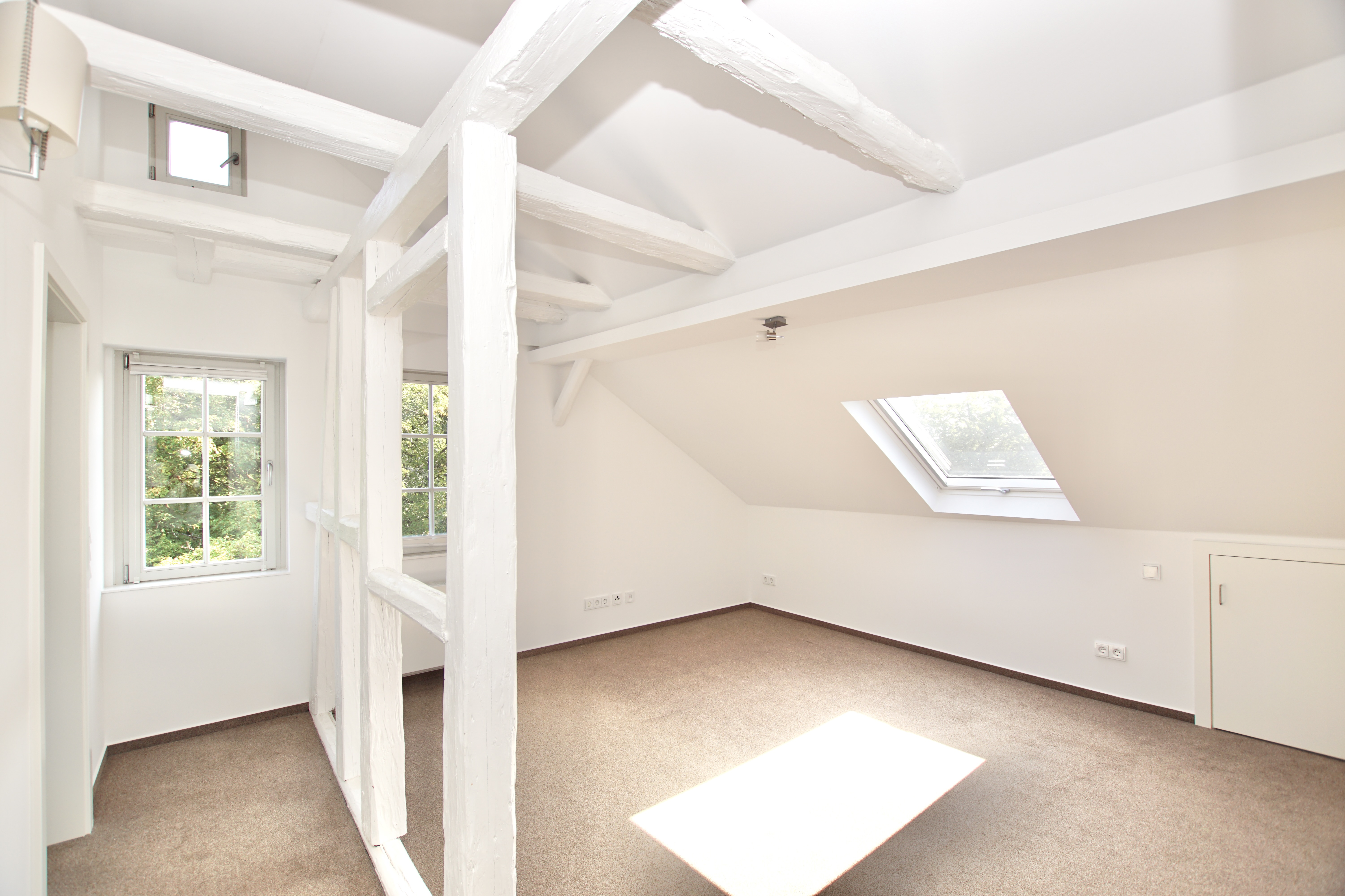 Beim Betreten der Wohnung gelangt man in einen großzügigen Wohnbereich, der viel natürliches Licht durch die Dachfenster erhält. Die Küche ist modern und voll ausgestattet. Das Schlafzimmer ist geräumig und bietet genug Platz für ein Bett sowie einen Kleiderschrank. Ein weiteres Zimmer kann als Arbeitszimmer genutzt werden. Das Tageslicht-Badezimmer ist mit einer Wanne ausgestattet und verfügt über ausreichend Stauraum.