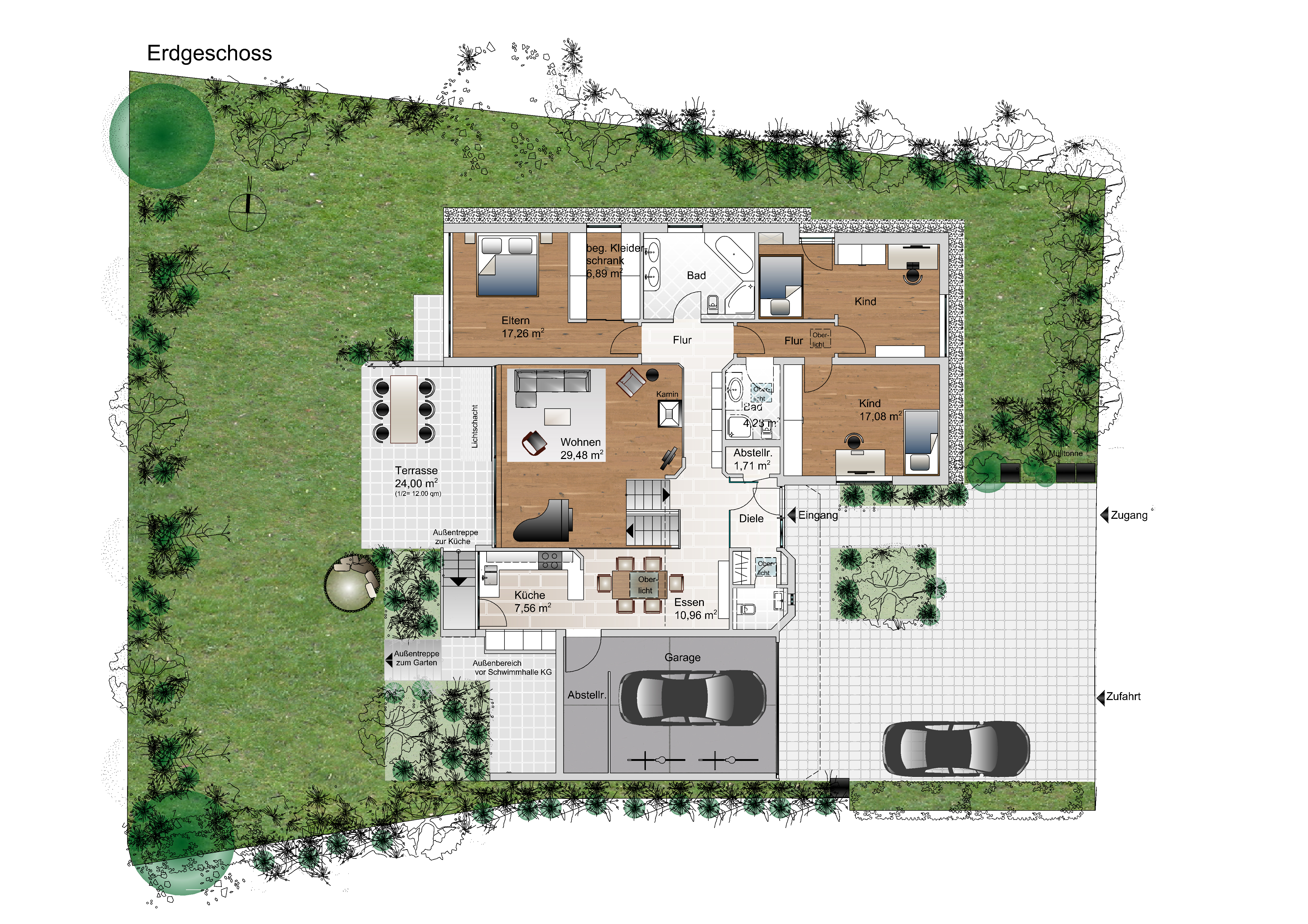 Für ihr Fahrzeug und Ihre Fahrräder steht eine große Garage mit elektrischem Tor direkt am Haus. Besonders bequem und sicher ist der direkte Zugang von der Garage in die Küche. Entspannter können Sie Ihre Einkäufe nicht nach Hause bringen. In die Garage integriert ist noch ein separater Abstellbereich.