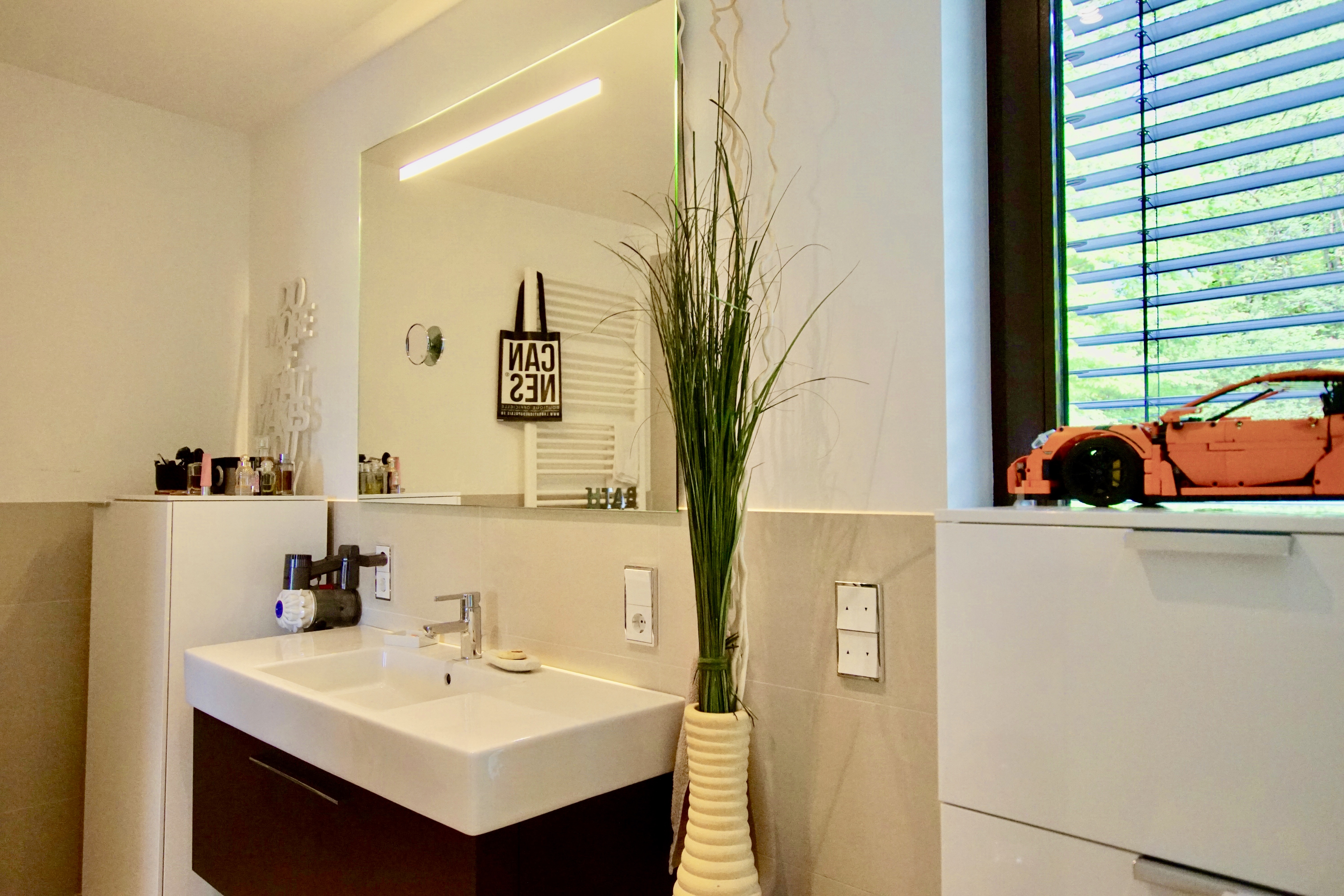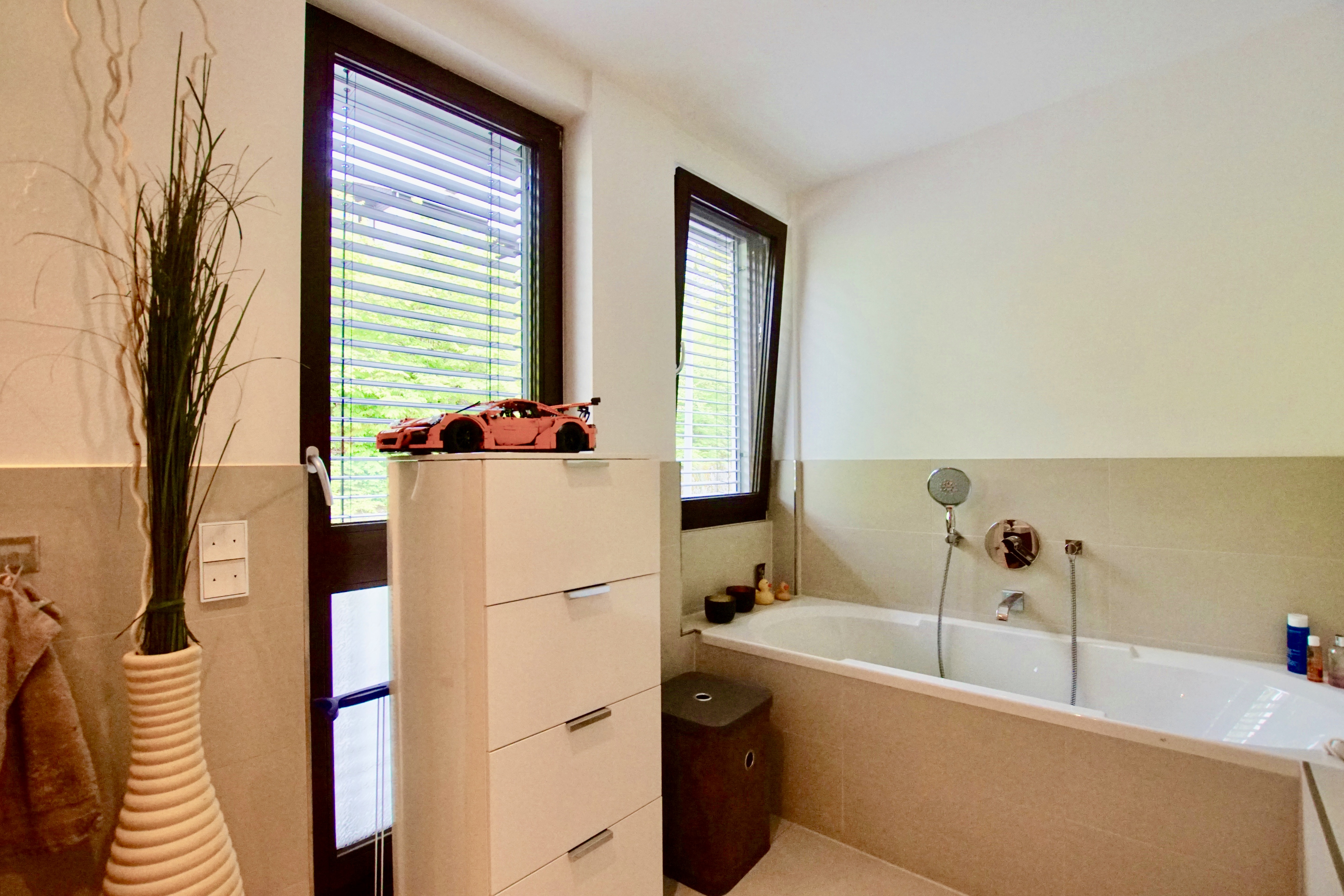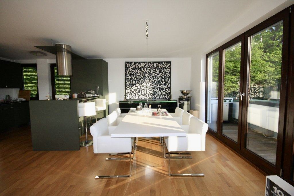 Vom Eingangsbereich mit Gäste-WC gelangen Sie über eine gradlinige Treppe ins Obergeschoss. Der offene Loft-Charakter das Wohn-, Ess- und Küchenbereichs wird durch das großzügige Schlafzimmer mit en-suite Bad ergänzt. Besonderes Highlight ist der um die Wohnung laufende Balkon mit großartigem Blick.